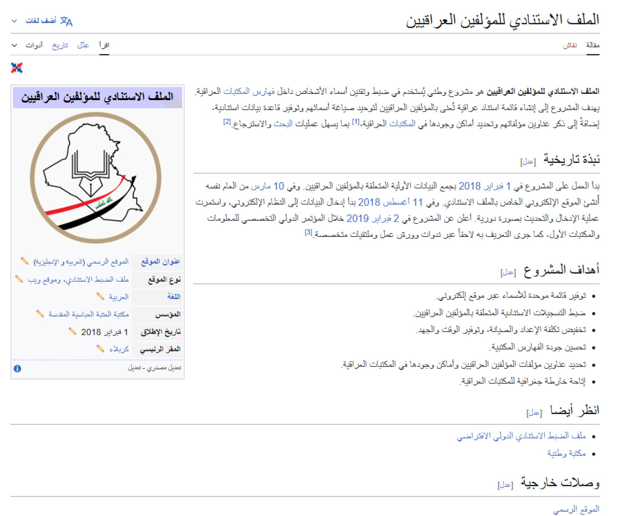 أعلن قسم الشؤون الفكرية والثقافية في العتبة العباسية المقدسة إدراج مشروع الملف الاستنادي للمؤلفين العراقيين في الموسوعة الحرة (ويكيبيديا). وقال مدير مركز الفهرسة ونظم المعلومات التابع للقسم، السيد حسنين الموسوي، إنَّ "إدارة محرري موسوعة ويكيبيديا العالمية أدرجت مشروع الملف الاستنادي للمؤلفين العراقيين في موقعها الرئيس؛ ليكون مرجعًا مفتوحًا ومتاحًا للجميع، في خطوة تُعد نقلة نوعية نحو تعزيز الحضور الدولي للجهود العراقية في مجال المعرفة والمكتبات". وأضاف أنَّ "مشروع الملف الاستنادي انطلق بهدف توثيق وضبط أسماء المؤلفين العراقيين وتسهيل الوصول إلى إنتاجهم الفكري عبر شبكة الإنترنيت، وقد أدرج المشروع سابقًا في منصة ويكي بيانات (Wikidata)، الأمر الذي شكل أساسًا لتعزيز حضوره الرقمي ومهَّد الطريق أمام ظهوره في موسوعة ويكيبيديا العالمية". وتابع الموسوي أنَّ "إدراج هذا المشروع في الموسوعة لا يقتصر على كونه إنجازًا تقنيًّا أو إعلاميًّا فحسب، بل يمثل اعترافًا عالميًّا بجدواه وأثره العلمي والثقافي، ويضع العراق ضمن خريطة الدول التي تسعى جديًّا إلى حفظ الهوية المعرفية والثقافية لمبدعيها".
