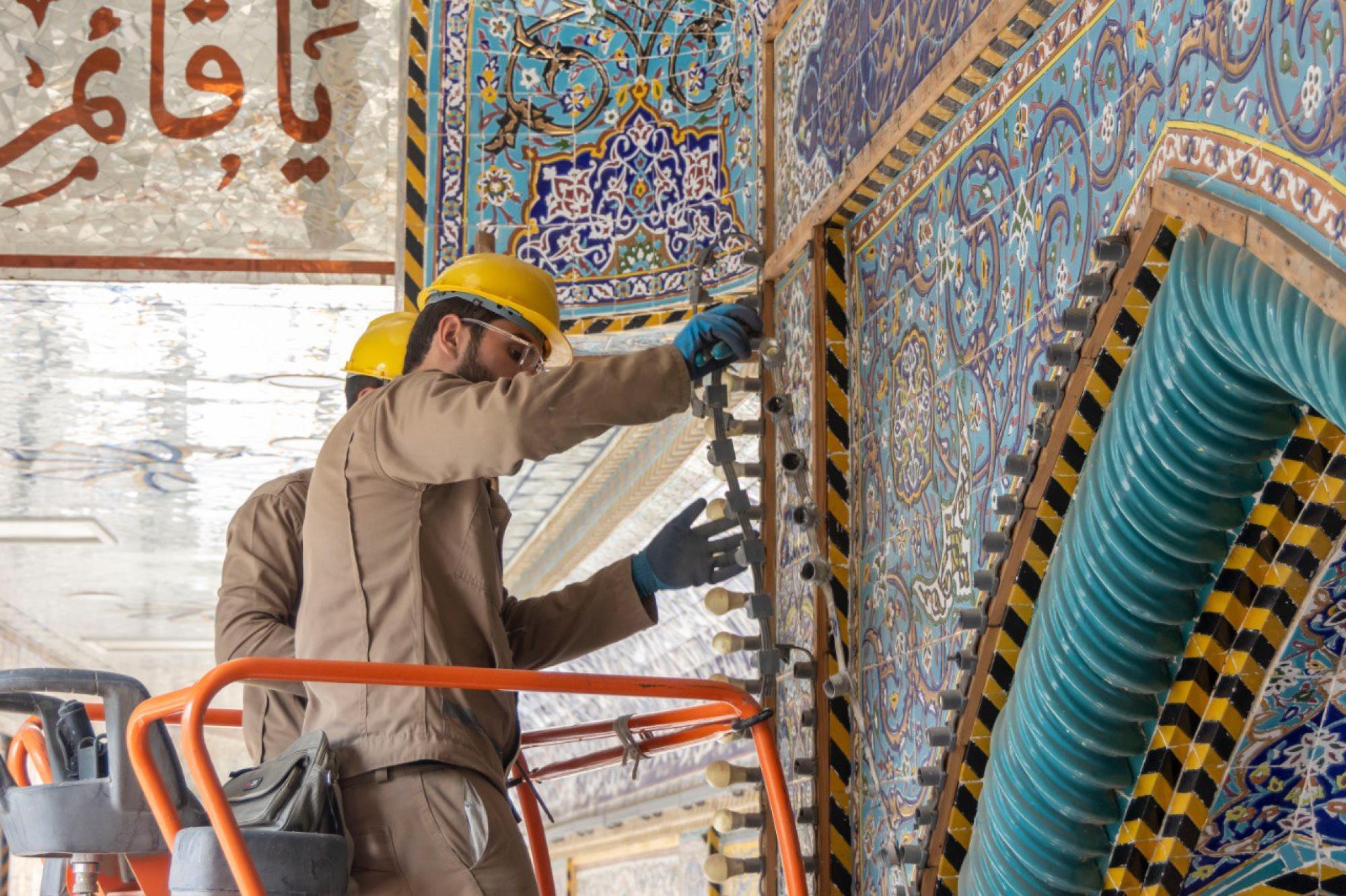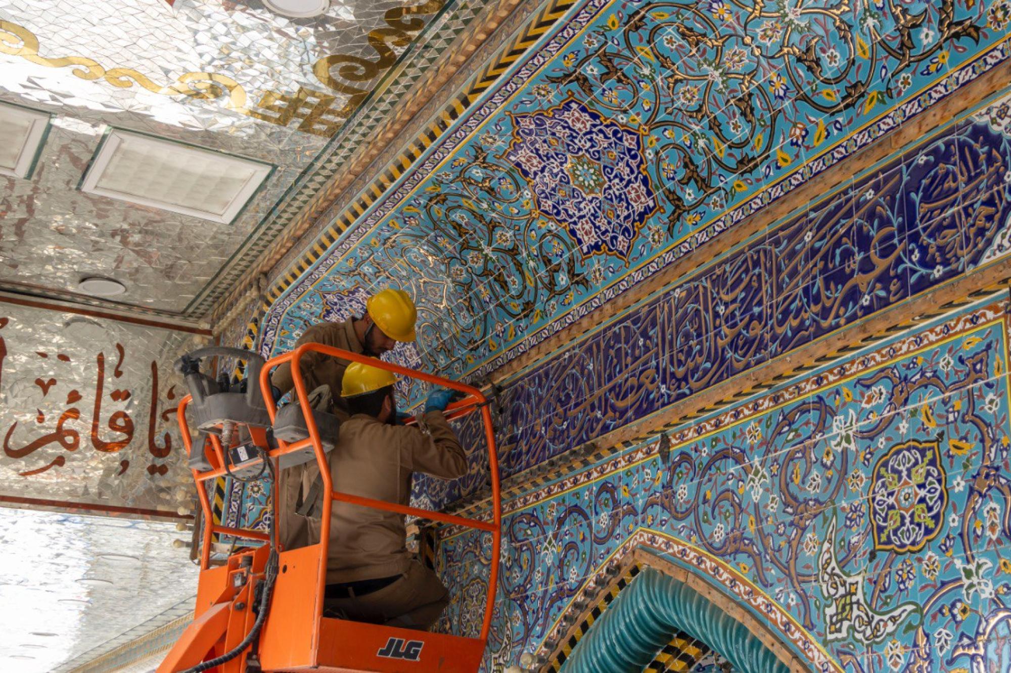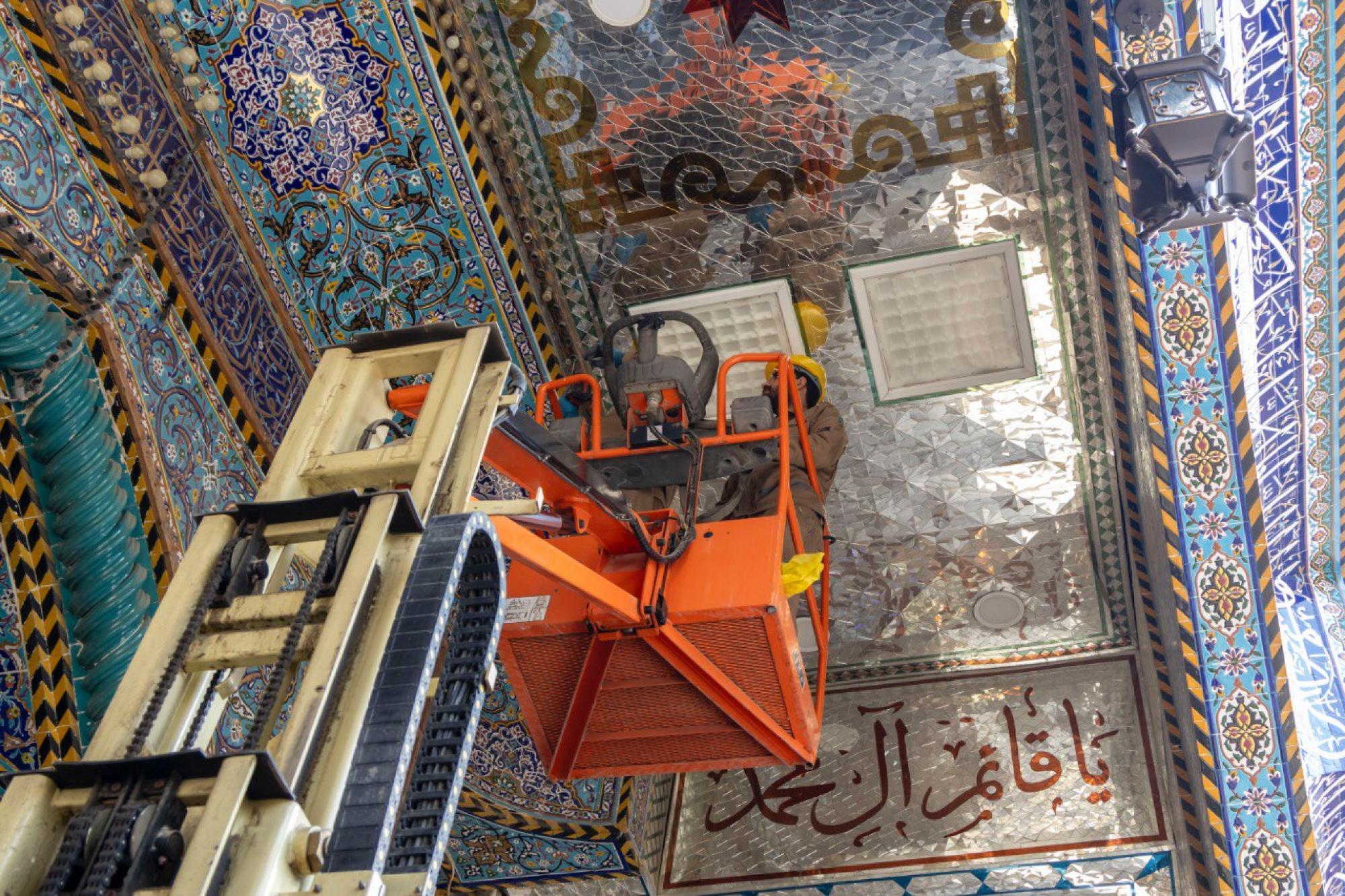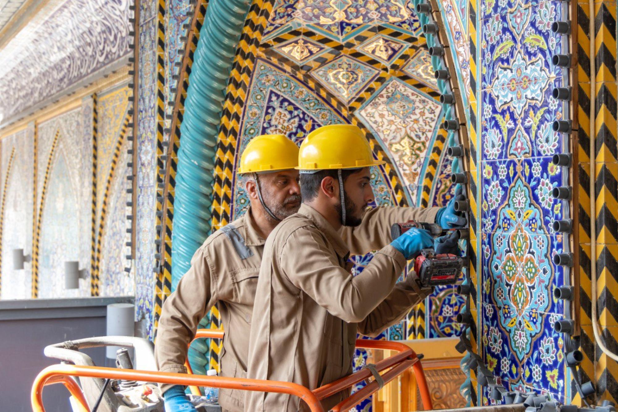 قسم المقام ينفذ أعمال إدامة لمصابيح الإنارة في أبواب المقام الشريف
