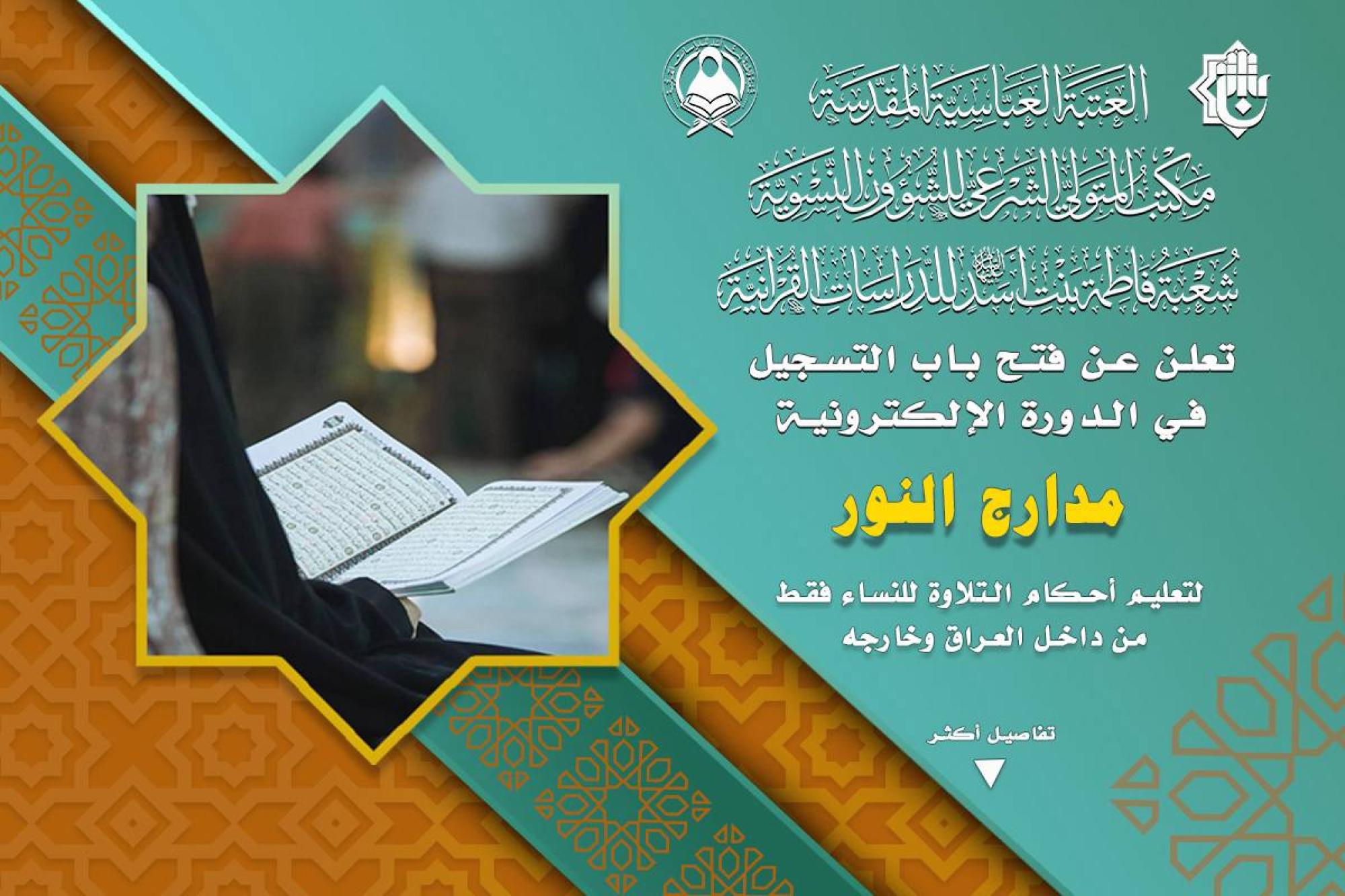 أعلنت شعبة فاطمة بنت أسد (عليها السلام) للدراسات القرآنية التابعة لمكتب المتولي الشرعي للشؤون النسوية، فتح باب التسجيل في دورتها الإلكترونية (مدارج النور) لأحكام التلاوة. وأطلقت الشعبة هذه الدورة بالتزامن مع ذكرى ولادة السيدة زينب (عليها السلام)، ونتيجة للإقبال الكبير والرغبة المتزايدة في تعلم أحكام كتاب الله المجيد. وتهدف الدورة إلى تمكين المشاركات من تعلم أحكام التلاوة الصحيحة وفهم قواعد التجويد بدقة وسلاسة وبأسلوب حديث. وأكدت الشعبة أنّ الدورة تُقام أسبوعيًّا في كل يوم سبت، ومخصصة للنساء فقط من كربلاء المقدسة، ومحافظات العراق، وكذلك من خارجه، وتستمر حتى نهاية شهر شعبان 1447هـ. شروط التسجيل: - الرغبة الصادقة والشغف الحقيقي لتعلم أحكام تلاوة القرآن - اجتياز اختبار القبول (يُعتذر عن قبول من لم تجتز الاختبار). - الالتزام بحضور الدروس الأسبوعية المباشرة. - إرسال البصمة الإلكترونية لضمان الحضور والمتابعة. - المواظبة على إرسال الواجبات المقررة في موعدها. آلية الدورة: - تقديم الدرس مرة واحدة أسبوعيًّا (عن بُعد). - إرسال الطالبة الواجبات إلكترونيًّا لمتابعة الأداء وتقييم التقدم. للتسجيل اضغط هنا ملاحظة: تمنح الطالبة شهادة مشاركة في نهاية الدورة إذا اجتازت نسبة النجاح، مع تقديم هدايا للمتفوقات.