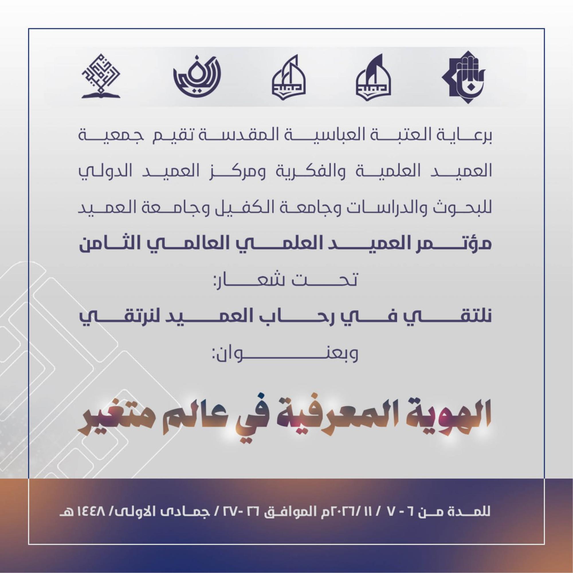 تدعو جمعية العميد العلمية والفكرية الباحثين للمشاركة في فعاليات مؤتمرها العلمي العالمي الثامن. وتقيم المؤتمر الجمعية برعاية العتبة العباسيَّة المقدسة، وبالتعاون مع مركز العميد الدولي للبحوث والدراسات التابع لقسم الشؤون الفكرية والثقافية في العتبة المقدسة، وجامعتي الكفيل والعميد. وأعلنت اللجنة المنظمة عن محاور مؤتمر العميد العلمي العالمي الثامن، وشروط المشاركة فيه، بهدف فتح الباب أمام الباحثين إلى المشاركة في إثراء جلساته ومحاوره بنتاجاتهم البحثيَّة. ويكون تقديم ملخص للبحث باللغتين العربية والإنجليزية وعلى وفق القالب (الفورمة) المعدَّ والموجود على الرابط: اضغط هنا بينما يكون إرسال الأبحاث على رابط الاستمارة الآتية: اضغط هنا