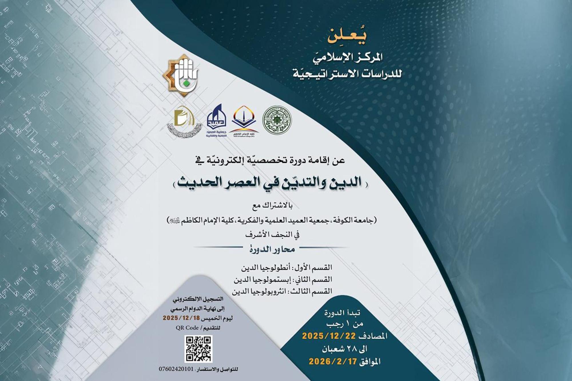 أعلن المركزُ الإسلامي للدراسات الاستراتيجية، التابع لقسم الشؤون الفكريّة والثقافيّة في العتبة العبّاسية المقدّسة، عن فتح باب التسجيل في دورته التخصصية الإلكترونيّة الموسومة: (الدين والتديّن في العصر الحديث). وتقام الدورة بالتعاون والشراكة مع جامعة الكوفة، وجمعية العميد العلمية والفكرية، وكلّية الإمام الكاظم(عليه السلام) للعلوم الإسلاميّة الجامعة. وتتضمّن الدورة ثلاثة محاور رئيسة، تشمل: أنطولوجيا الدين، وإبستمولوجيا الدين، وأنثروبولوجيا الدين، ويقدّم محاضراتها نخبةٌ من الأساتذة والباحثين المختصّين في هذا المجال، وتُقام بصيغة إلكترونية بالكامل، مع منح المشاركين شهادةَ مشاركةٍ معتمدة من الجهات الشريكة.