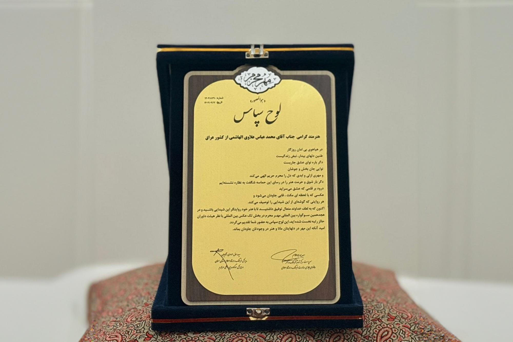 حاز مصور المجمَع العلمي للقرآن الكريم في العتبة العباسية المقدّسة، السيّد محمد عباس الهاشمي، المرتبةَ الأولى في مسابقة مهر محرم الدولية. وقال الهاشمي: إنّ الصورة الفائزة حملت عنوان "إذا كان شعوري بالأمان تحت رايتك، فكيف هو شعوري تحت عباءتك؟"، وقد نالت المركز الأوّل ضمن المسابقة التي تنظّمها وزارة الثقافة والإرشاد الإسلامي في إيران. وأضاف أنّ المسابقة شهدت مشاركة 5130 صورة فوتوغرافية، قُبِلَ منها 65 صورة لمصورين من دول عدّة، بينها: العراق، وإيران، والبحرين، ولبنان، وإنكلترا، والسعودية، والهند.