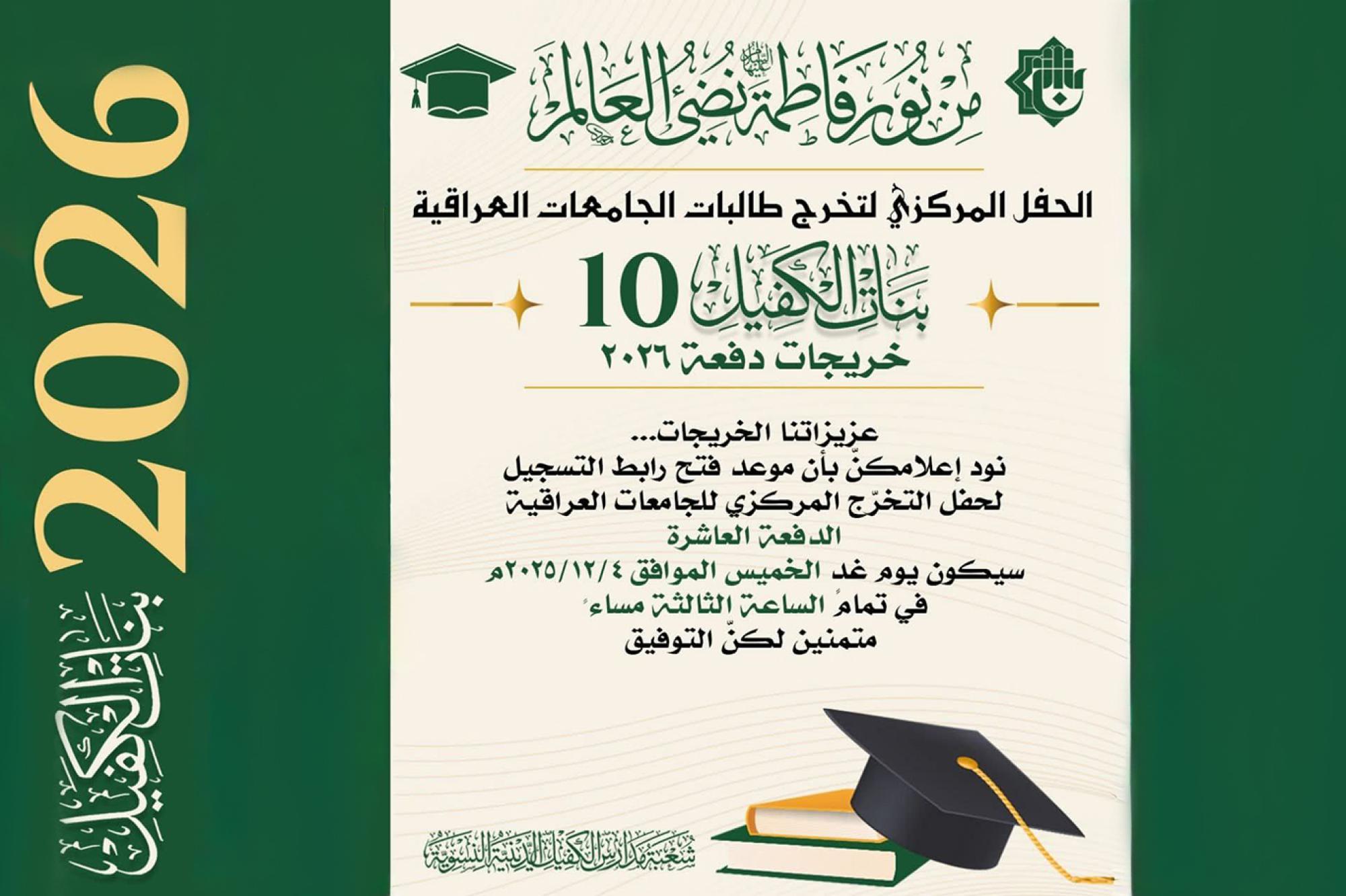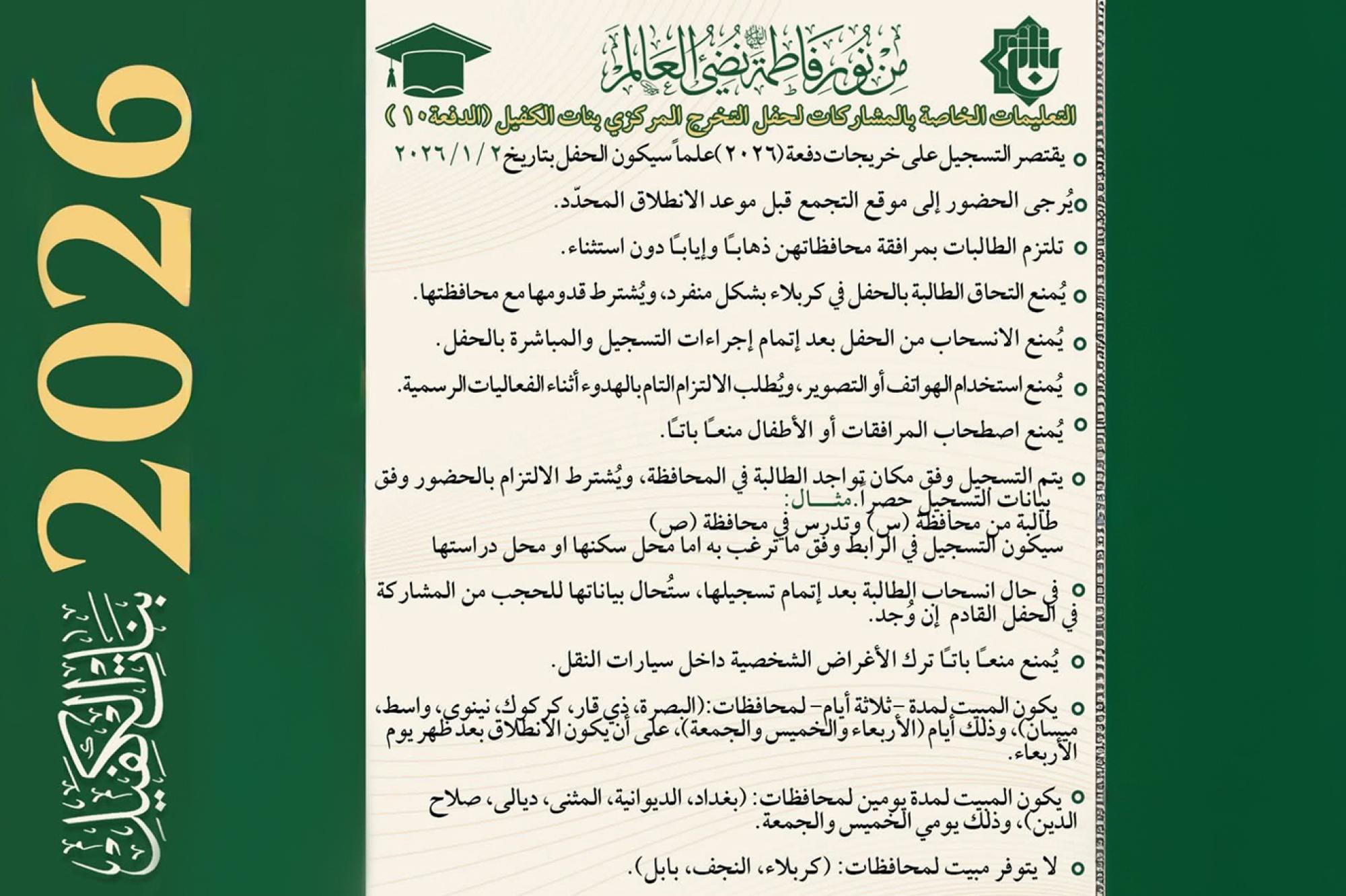 أعلنت العتبة العباسية المقدسة التعليمات الخاصة بالتسجيل في الحفل المركزي لتخرج طالبات الجامعات العراقية والدول الإسلامية (دفعة بنات الكفيل العاشرة). وفي أدناه التعليمات: - يقتصر التسجيل على خريجات دفعة (2026) علمًا أنّ الحفل سيكون يوم الجمعة الموافق 2/1/2026م. - الحضور إلى موقع التجمّع قبل موعد الانطلاق المحدّد. - تلتزم الطالبات بمرافقة محافظاتهن ذهابًا وإيابًا من دون استثناء. - يُمنع التحاق الطالبة بالحفل في كربلاء بشكل منفرد، ويُشترط قدومها مع محافظتها. - يُمنع الانسحاب من الحفل بعد إتمام إجراءات التسجيل والمباشرة بالحفل. - يُمنع استخدام الهواتف أو التصوير، والالتزام التام بالهدوء في أثناء الفعاليات الرسمية. - يُمنع اصطحاب المرافقات أو الأطفال منعًا باتًّا.