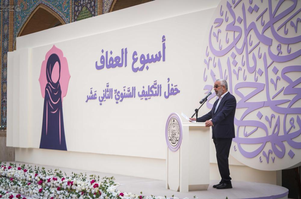 جاء ذلك خلال مراسم الاحتفال بمهرجان التكليف السنوي الثاني عشر ضمن فعاليات أسبوع العفاف الذي جرى صباح هذا اليوم المصادف 19 جمادى الآخرة 1447 للهجرة، والخاص باستذكار الولادة الميمونة لسيدة نساء العالمين الزهراء فاطمة (عليها السلام).