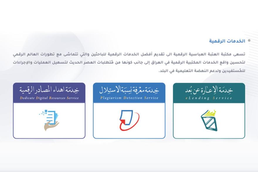 تعمل مكتبة العتبة العباسية المقدسة الرقمية على تعزيز الحضور الرقمي للمكتبة العامة عن طريق توفير مصادر وخدمات معرفية إلكترونية تسهم في دعم العملية التعليمية والبحثية في العراق، بما ينسجم مع متطلبات التطور العلمي والتكنولوجي. وقد طوّرها مركز المعلومات الرقمية التابع لقسم الشؤون الفكرية والثقافية في العتبة المقدسة، معتمدًا أحدث التقنيات ومعايير الجودة العالمية، إلى جانب اهتمامه برقمنة النتاج العلمي العراقي والحفاظ عليه وإتاحته؛ لإبراز مكانة العراق العلمية على المستويين الإقليمي والدولي. مشروع حفظ النتاج العلمي العراقي أحد المشاريع الوطنية التي يشرف عليها مركز المعلومات الرقمية في العتبة المقدسة، ويهدف إلى حماية الإرث العلمي العراقي من الضياع والتلف، وضمان استدامته للأجيال القادمة.
