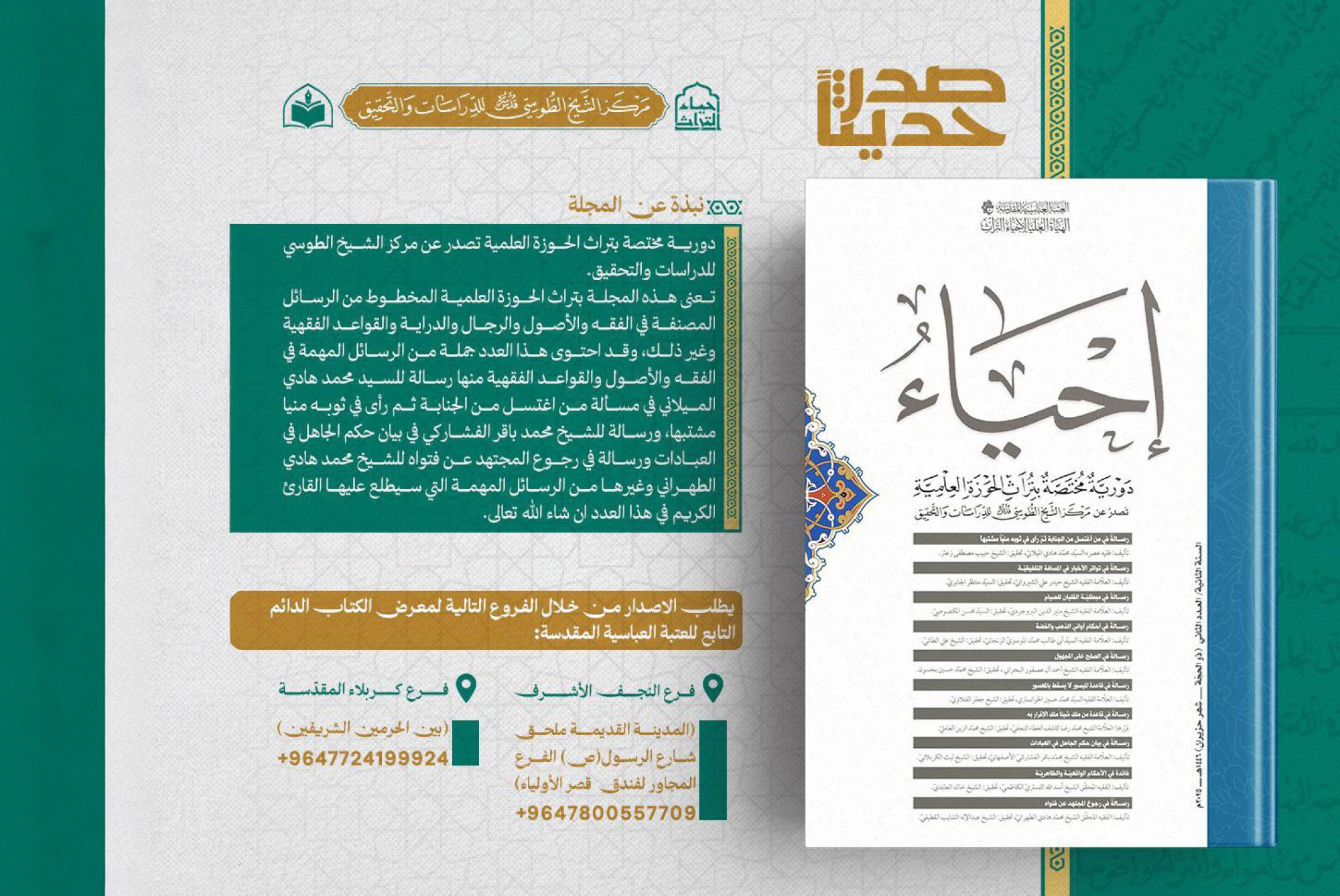 أصدرت الهيأة العليا لإحياء التراث في العتبة العباسية المقدسة، العدد الثاني من مجلة إحياء. ويتولى إصدار المجلة مركز الشيخ الطوسي للدراسات والتحقيق التابع للهيأة. وتضمن العدد جملة من الرسائل العلمية المهمة، منها: رسالة للسيد محمد هادي الميلاني في مسألة غسل الجنابة، ورسالة للشيخ محمد باقر الفشاركي في بيان حكم الجاهل في العبادات، ورسالة في رجوع المجتهد عن فتواه للشيخ محمد هادي الطهراني، إلى جانب رسائل أخرى.