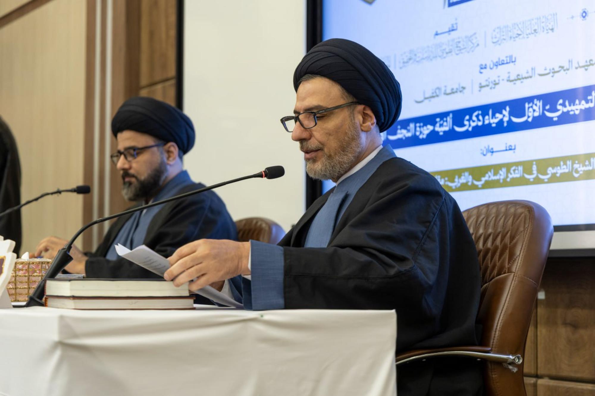 أطلقت العتبة العباسية المقدسة فعاليات اليوم الثاني للمؤتمر العلمي التمهيدي الأول، لإحياء ذكرى ألفية الحوزة العلمية في النجف الأشرف. ويقيم المؤتمر مركز الشيخ الطوسي للدراسات والتحقيق، التابع للهيأة العليا لإحياء التراث في العتبة المقدسة، بالتعاون مع جامعة الكفيل ومعهد البحوث الشيعية – تورنتو، تحت شعار (حوزة النجف الأشرف: ألف عام من العطاء) وبعنوان (تراث الشيخ الطوسي في الفكر الإسلامي والغربي: مقاربات معاصرة)، في جامعة الكفيل. وشهدت فعاليات الافتتاح حضور عدد من مسؤولي العتبة العباسية المقدسة وشخصيات حوزوية وأكاديمية من داخل العراق وخارجه. واستُهلت فعاليات اليوم الثاني بتلاوة آيات من الذكر الحكيم، ثم عقد جلستين بحثيتين، الأولى باللغة العربية ترأسها السيد الدكتور عبد الحكيم الصافي، والثانية بالإنكليزية ترأسها السيد فاضل بحر العلوم، تناقش عبرها عددًا من البحوث العلمية لباحثين من دول عربية وإسلامية وأجنبية وتتمحور موضوعاتها عن شيخ الطائفة الطوسي (قدس سره) ومؤلفاته العلمية. ويمثل الاحتفاء بمرور ألف عام على تأسيس حوزة النجف الأشرف، التي تتزامن مع ذكرى قدوم الشيخ أبي جعفر محمد بن الحسن الطوسي (قدس سره) لهذه المدينة المقدسة عام 448هـ، فرصة لإبراز الدور الحضاري والعلمي لمدينة النجف الأشرف وحوزتها المباركة. وتضمنت فعاليات اليوم الأول كلمة للمتولي الشرعي للعتبة المقدسة سماحة العلامة السيد أحمد الصافي، وكلمة للهيأة العليا، وكلمة لمعهد البحوث الشيعية/ تورنتو، إلى جانب إزاحة الستار عن بعض إصدارات ألفية حوزة النجف الأشرف، وعرض فيديوي وقصيدة شعرية للشيخ باقر الجدي، فضلاً عن عقد جلسة بحثية.