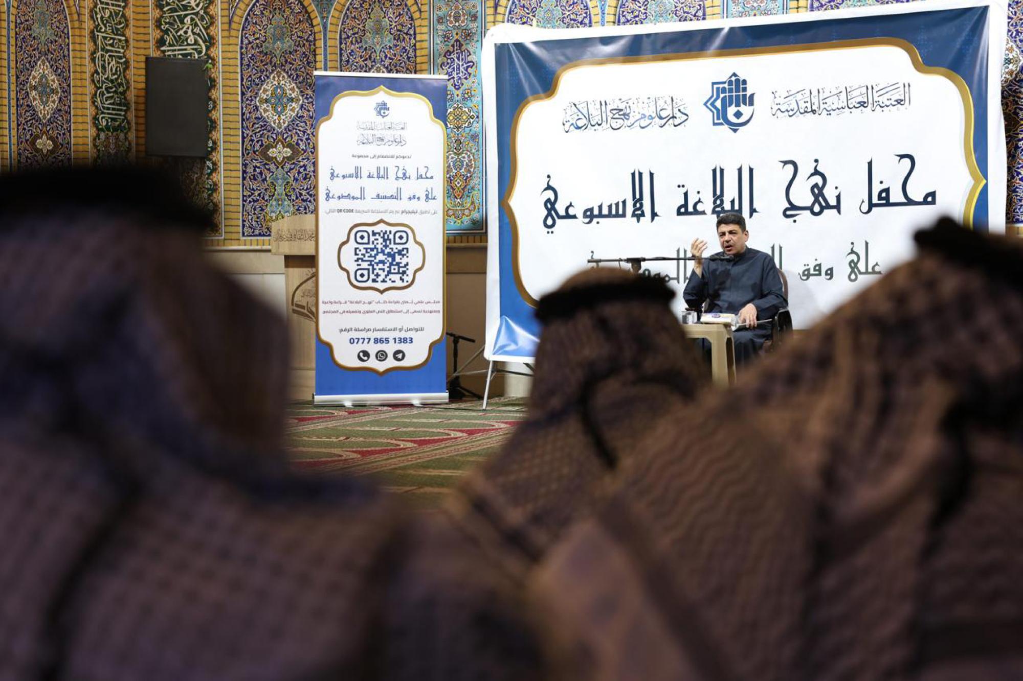 نظّمت دار علوم نهج البلاغة في العتبة العباسية المقدسة المحاضرة الثانية من محفل نهج البلاغة الأسبوعي على وَفقِ التصنيف الموضوعي، في محافظة ذي قار. وقال رئيس الدار الدكتور لواء العطية: إنّ "الدار نظّمت المحاضرة الثانية من المحفل بمحافظة ذي قار، في جامع الإمام عليّ (عليه السلام)". وأضاف أنّ "المحفل ملتقى علمي يهدف إلى إعادة قراءة كتاب نهج البلاغة قراءةً متعمّقة، تسعى إلى إبراز مضامين النص العلوي وتفعيله في الواقع الاجتماعي". من جانبه، أوضح محاضر المحفل الشيخ هاني الربيعي أنّ "محاضرة هذا الأسبوع تناولت مجموعة من الأبعاد التربوية والفكرية المستلهمة من وصايا الإمام علي (عليه السلام)، التي ركّزت على العطاء، وأهمية اختيار الصحبة الصالحة، إلى جانب التأكيد على إدارة النفس في العبادة بروح من الرفق والحكمة مع الالتزام بالفرائض".