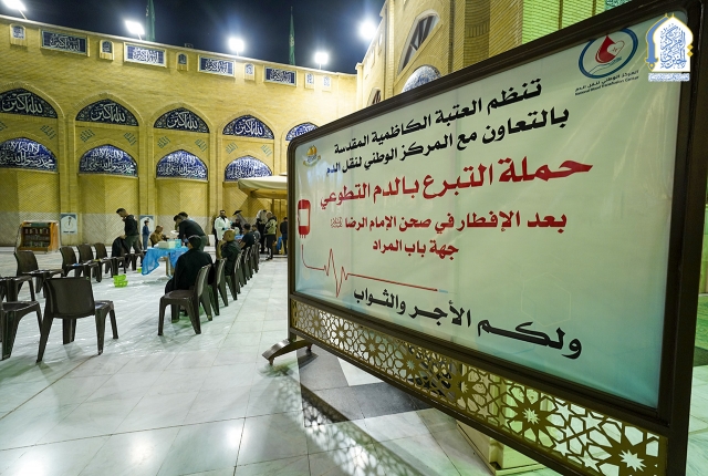 انطلاقاً من الحسّ الإيماني والشعور بالمسؤولية وتعزيز الانتماء الإنساني للإسهام وبشكل فاعل في توفير كميات وأنواع مختلفة من أصناف الدم للمرضى والمصابين الراقدين في المستشفيات وتعزيز رصيد المؤسسات الصحية، تتواصل الأمانة العامة للعتبة الكاظمية المقدسة وبالتعاون والتنسيق مع المركز الوطني لنقل الدم بحملات التبرع بالدّم الطوعية الأسبوعية خلال شهر رمضان المبارك في رحاب الصحن الكاظمي الشريف، حيث تُسهم هذه المبادرة في إشاعة ثقافة العطاء والتعاون الإنساني بين أبناء بلدنا العزيز والشعور بمعاناة الآخرين، فضلاً عن توفير بعض هذه الكميات من الدم للمصابين بالأمراض السرطانية وأمراض الدم الوراثي.