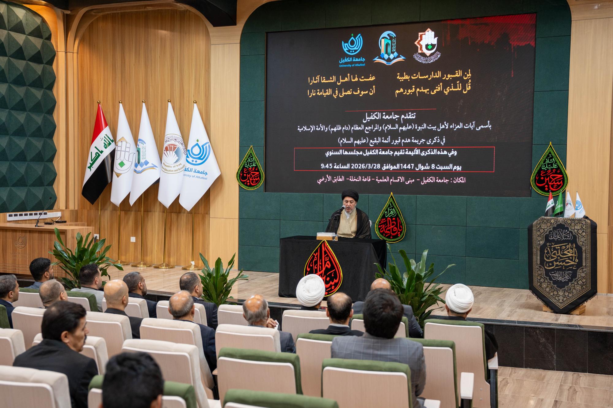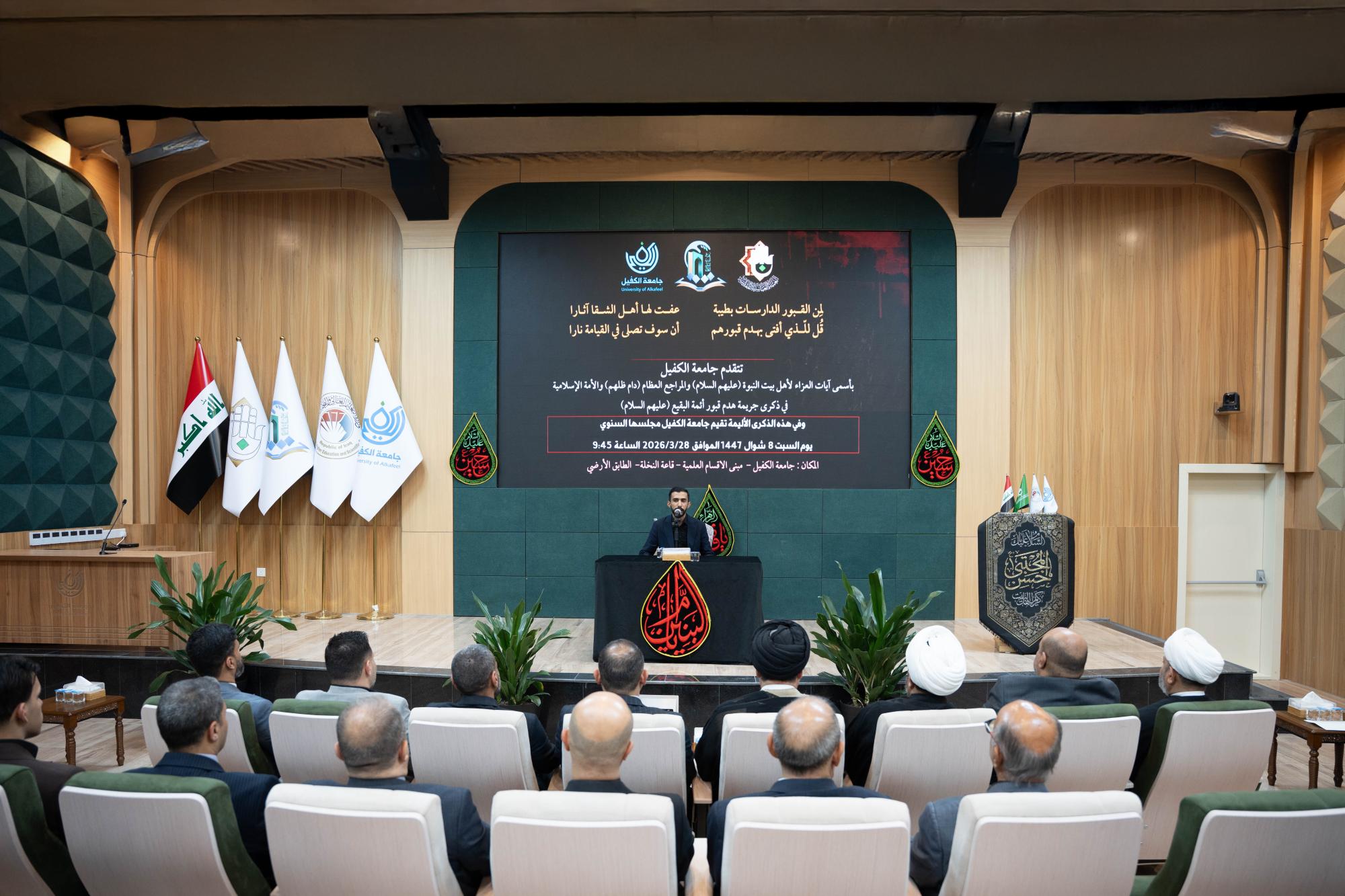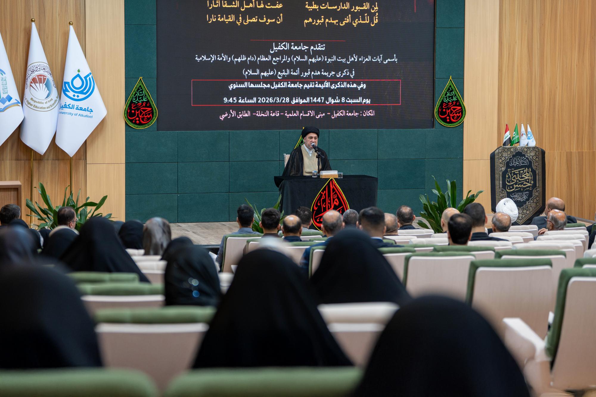 نظم قسم الإرشاد النفسي والتوجيه التربوي في جامعة الكفيل، مجلسًا عزائيًّا بذكرى هدم قبور أئمة البقيع (عليهم السلام). واستُهل المجلس بتلاوة مباركة من آيات الذكر الحكيم تلاها القارئ علي الزبيدي من معهد القرآن الكريم التابع للمجمع العلمي في العتبة العباسية المقدسة، أعقبتها محاضرة دينية ألقاها سماحة السيد جعفر المروج تناول فيها مكانة المراقد المقدسة وأهمية الحفاظ عليها بوصفها جزءًا أصيلًا من الهوية الإسلامية. وأكد المروج في محاضرته ضرورة التصدي للفكر المتطرف الذي يستهدف المقدسات، مشددًا على أهمية نشر الوعي وتعزيز القيم الدينية والإنسانية في المجتمع.