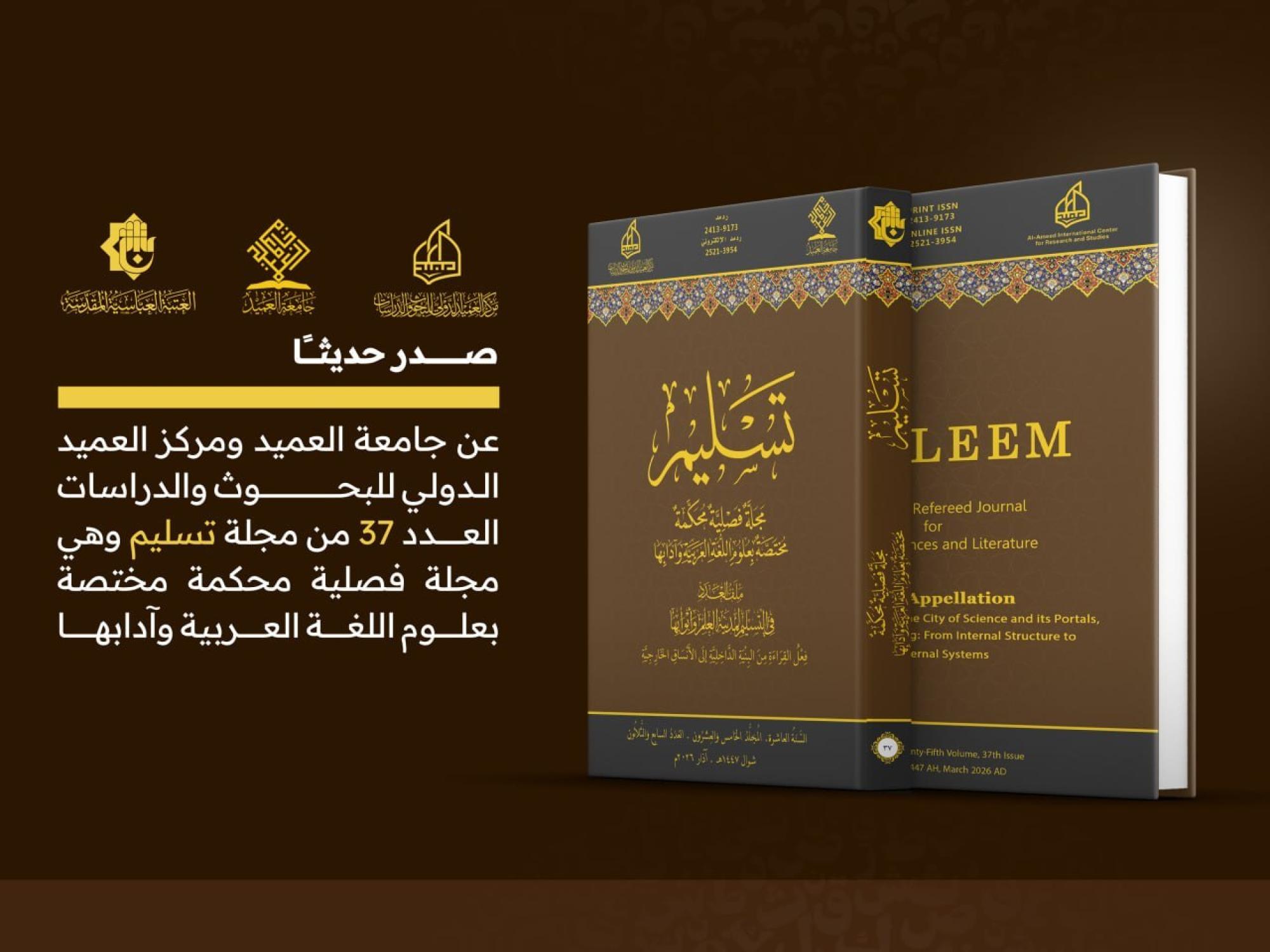 صدر عن قسم الشؤون الفكرية والثقافية في العتبة العباسية المقدسة وجامعة العميد العدد 37 من مجلة (تسليم) المحكمة. وتعد المجلة التي يصدرها مركز العميد الدولي للبحوث والدراسات التابع للقسم بالتعاون مع الجامعة، من المجلات الفصلية المحكمة المختصة بعلوم اللغة العربية وآدابها ومعتمدة للنشر والترقيات العلمية. وجاء الإصدار الجديد بعنوان (في التَّسليم لمدينة العلم وأبوابها: في حركة تداوليَّة الخطاب من النصِّ إلى التَّواصل)، وتضمّن ثمانية بحوث علمية متخصصة تتناول مواضيع متنوّعة في مجالات اللغة والأدب، إضافةً إلى دراسة عن أعداد المجلة السابقة وملفّ خاص.