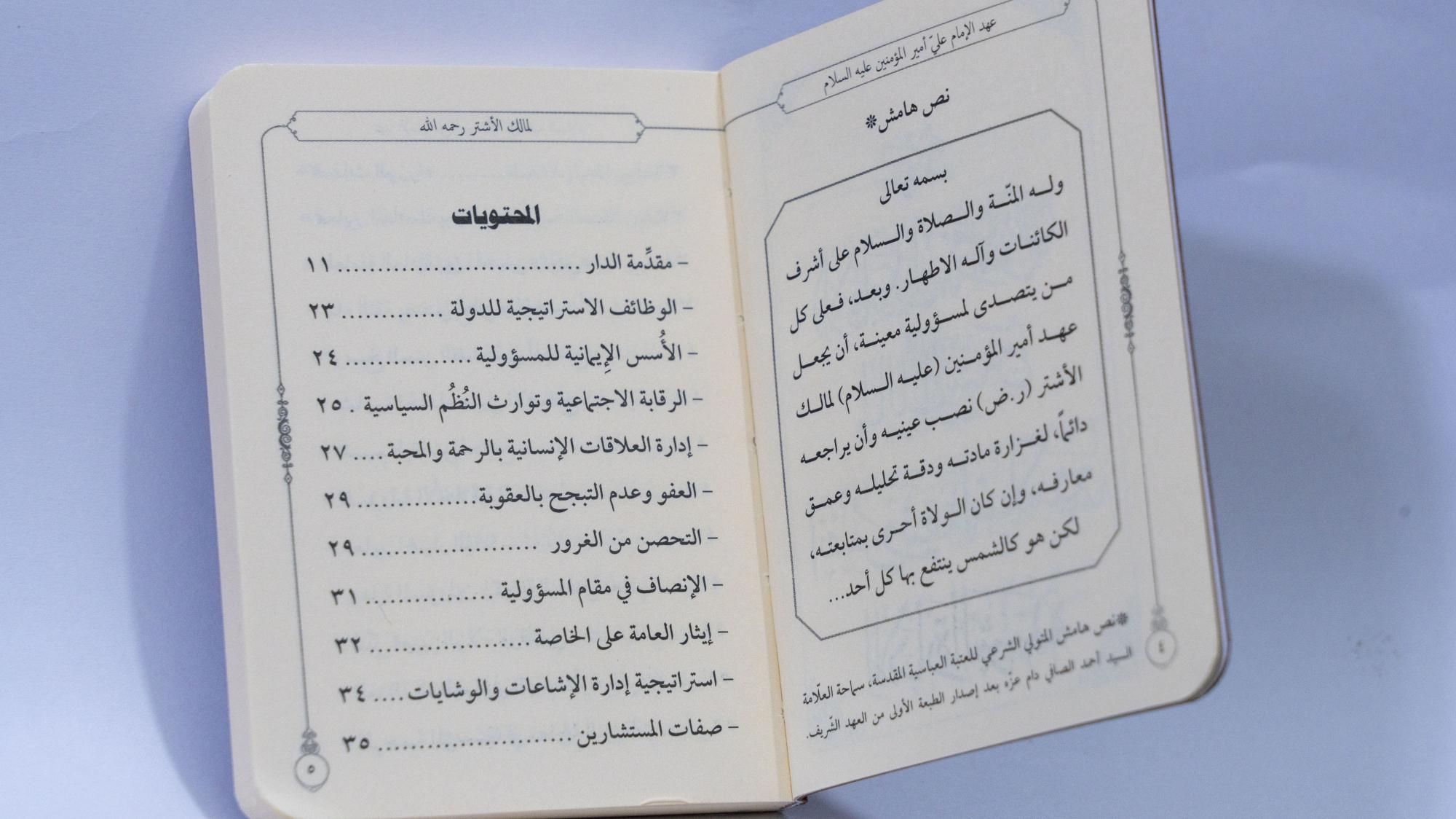 تستعدّ دارُ علوم نهج البلاغة التابعة للعتبة العبّاسية المقدّسة، لتوزيع 1000 نسخةٍ من الطبعة الثانية لكتاب عهد الإمام علي(عليه السلام) إلى مالك الأشتر، على أقسام العتبة المقدّسة. وقال رئيسُ الدار الدكتور لواء العطية: إنّ "الدار تستعدّ لتوزيع 1000 نسخةٍ من الطبعة الثانية، الخاصّة بكتاب عهد الإمام علي(عليه السلام) إلى مالك الأشتر، على مسؤولي العتبة المقدّسة لتعزيز مفاهيم الحوكمة الرشيدة والإدارة الأخلاقيّة، للإسهام في بناء بيئة عملٍ تستند على مبادئ العدالة التي أسَّس لها أميرُ المؤمنين (عليه السلام)". وأضاف، أنّ "مشروع توزيع الكتاب يمثّل خطوةً لتنفيذ الرؤية المعرفية للدار في تحويل المفاهيم النظرية للعهد الشريف إلى ممارساتٍ إداريّة واقعية، تجسيدًا لتوجيهات سماحة العلّامة السيد أحمد الصافي، وليكون مرجعًا معرفيًا في أداء المهامّ".