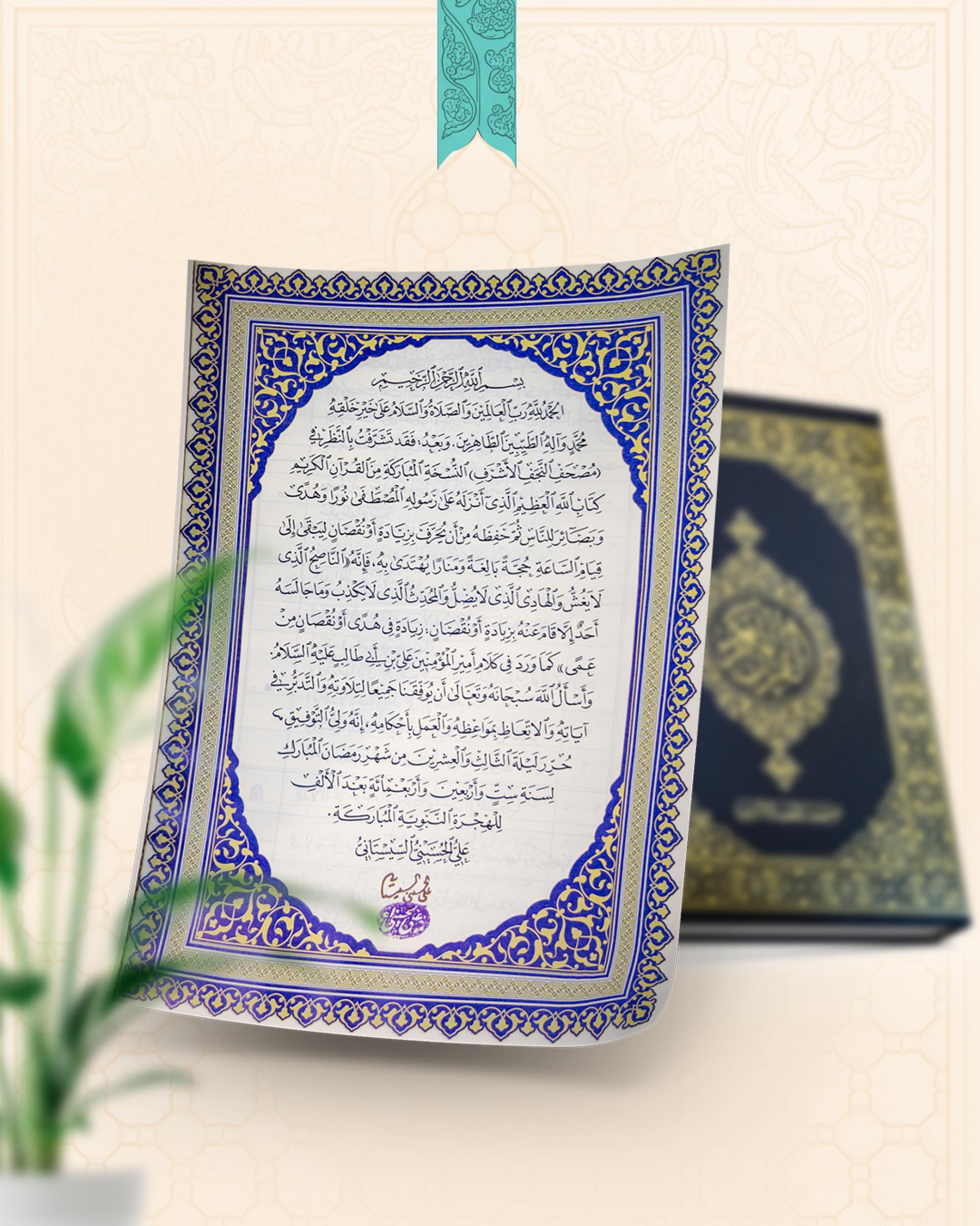 بارك المرجع الديني الأعلى سماحة آية الله العظمى السيد علي الحسيني السيستاني (دام ظلّه)، الطبعة الأولى من (مصحف النجف الأشرف)، الذي يقام حفل إزاحة الستار عنه يوم غدٍ الأربعاء. وفي أدناه نصّ المباركة: بسم الله الرحمن الرحيم الحمد لله رب العالمين والصلاة والسلام على خير خلقه محمد وآله الطيبين الطاهرين. وبعد، فقد تشرَّفت بالنظر في (مصحف النجف الأشرف) النسخة المباركة من القرآن الكريم كتاب الله العظيم الذي أنزله على رسوله المصطفى نورًا وهدىً وبصائرَ للناس ثم حَفِظه من أن يحرّف بزيادة أو نقصان ليبقى إلى قيام الساعة حجة بالغة ومنارًا يهتدى به، فإنّه «الناصحُ الذي لا يغشّ والهادي الذي لا يضلّ والمحدّث الذي لا يكذب وما جالسه أحد إلا قام عنه بزيادة أو نقصان، زيادة في هدىً أو نقصان من عمى» كما ورد في كلام أمير المؤمنين علي بن أبي طالب (عليه السلام). وأسأل الله سبحانه وتعالى أن يوفّقنا جميعًا لتلاوته والتدبر في آياته والاتّعاظ بمواعظه والعمل بأحكامه، إنّه ولي التوفيق. حرر ليلة الثالث والعشرين من شهر رمضان المبارك لسنة ست وأربعين وأربعمائة بعد الألف للهجرة النبوية المباركة. علي الحسيني السيستاني.