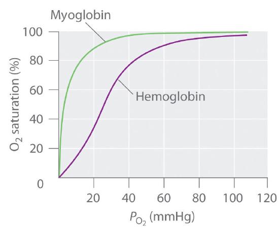 In contrast, the O2-binding curve of hemoglobin is S shaped (Figure 1.3)). As shown in the curves, at low oxygen pressures, the affinity of deoxyhemoglobin for O2 is substantially lower than that of myoglobin, whereas at high O2 pressures the two proteins have comparable O2 affinities. The physiological consequences of the unusual S-shaped O2-binding curve of hemoglobin are enormous. In the lungs, where O2 pressure is highest, the high oxygen affinity of deoxyhemoglobin allows it to be completely loaded with O2, giving four O2 molecules per hemoglobin. In the tissues, however, where the oxygen pressure is much lower, the decreased oxygen affinity of hemoglobin allows it to release O2, resulting in a net transfer of oxygen to myoglobin.