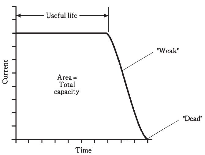When an ideal cell or battery is used, it delivers a fairly constant current for awhile, and then the current starts to fall off (Fig. 1). Some types of cells and batteries approach this ideal behavior, called a flat discharge curve, and others have current that declines gradually, almost right from the start. When the current that a battery can provide has tailed off to about half of its initial value, the cell or battery is said to be “weak.” At this time, it should be replaced. If it’s allowed to run all the way out, until the current actually goes to zero, the cell or battery is “dead.” Some rechargeable cells and batteries, especially the nickel-cadmium type, should never be used until the current goes down to zero, because this can ruin them.