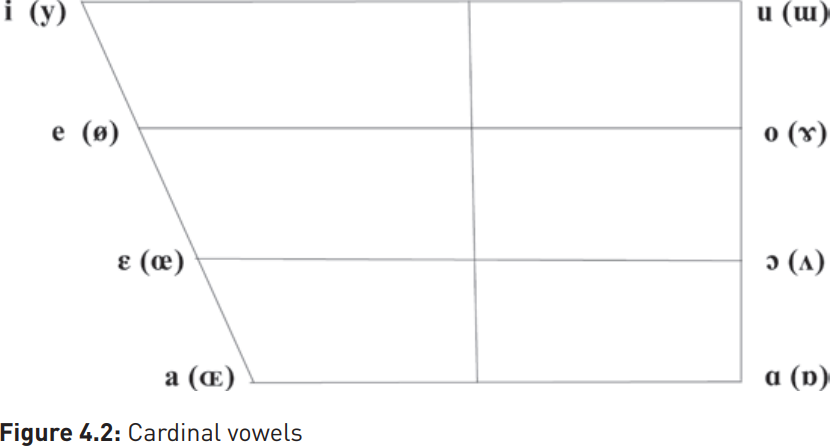 These cardinal vowels are located within an idealized version of the vocal tract known as the vowel quadrilateral (shown in the diagram on the next page). These vowels are numbered for ease of reference: phoneticians refer to the primary cardinal vowels 1–8, shown in bold, and the secondary cardinal vowels 9–16, shown in brackets.