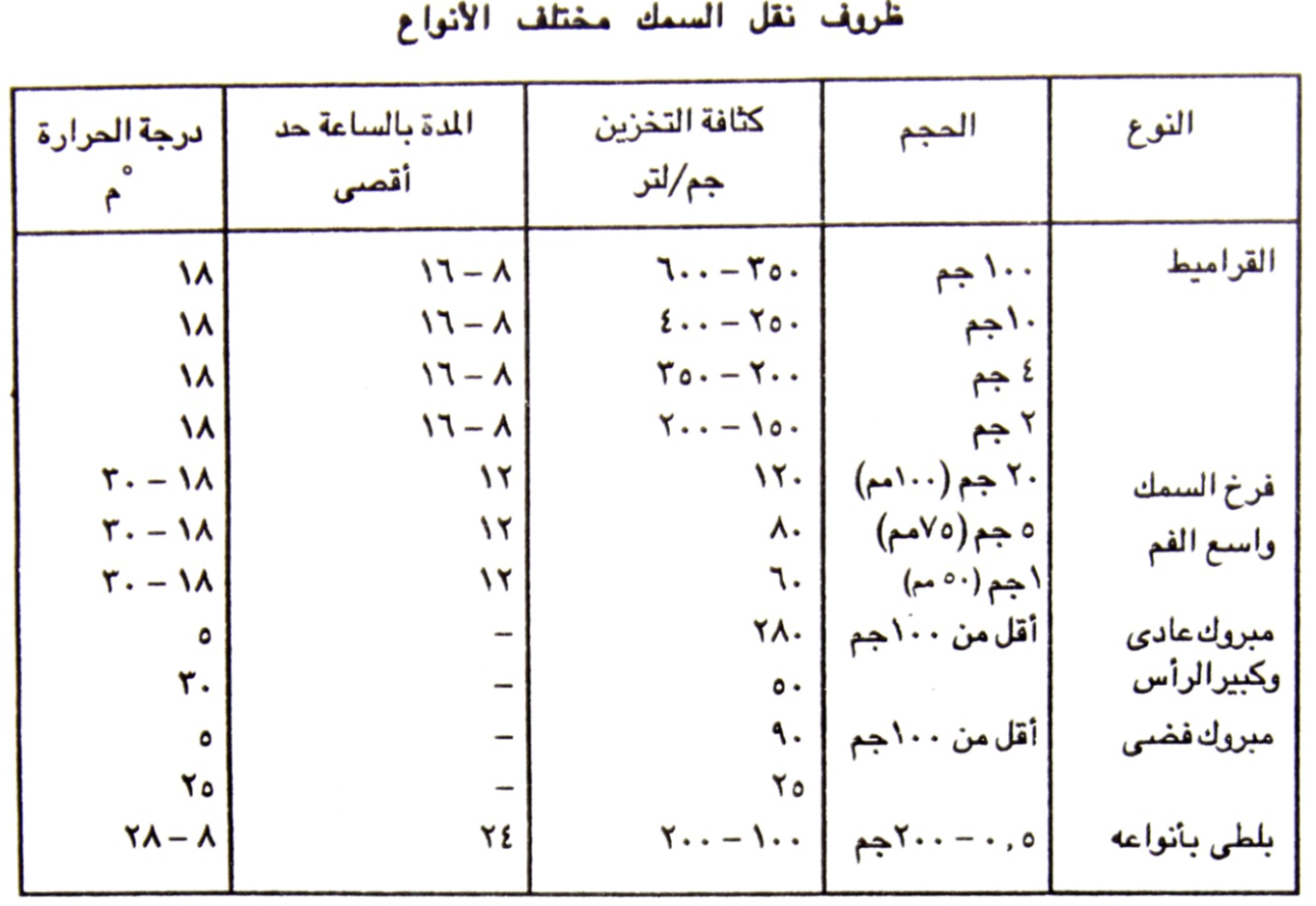 وتشكل عملية الصيد والتداول والنقل أنواع من الضغوط علي الأسماك وتؤدي إلي تلف طبيعي (إزالة القشور)، وتغييرات في كيمياء الدم، وزيادة استهلاك الأوكسجين، ومشاكل في التنظيم الأسموزي، وزيادة الحساسية للأمراض. وهناك أنواع صعب نقلها مثل المبروك الفضي، لذلك توضع بأقل عدد عند نقلها. وفي الأعداد القليلة (عدة آلاف) تنقل في أكياس بلاستيك ثلثها ماء والباقي مليء بالأوكسجين قبل لحامها، وتستعمل أكياس مزدوجة للأمان. وقد تستخدم صناديق معزولة للنقل، تسع حتي 3 آلاف لتر، وتنقل علي جرارات أو سيارات نقل. ويجب أن تكون التانكات حوافها مستديرة لتقليل تلف الأسماك، وتتصل عادة بجهاز تهوية أو أوكسجين. وهناك تانكات سعتها 10 آلاف لتر أو أكبر مجهزة بتبريد وتهوية. وفي روسيا هناك عربات قطارات معدلة خصيصا لنقل الزريعة. وهناك توصيات بكثافة السمك عند نقله في الجدول التالي: