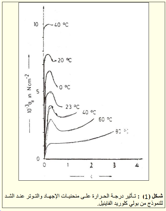 لدرجة الحرارة تأثير كبير على منحنى الإجهاد والاستطالة ، فعند ارتفاع درجة الحرارة يتغير منحنى الإجهاد باتجاه السلوك المطاطي وبانخفاض درجة الحرارة يتغير المنحنى باتجاه السلوك الهش (brittle). ويبين الشكل (4) تأثير درجة الحرارة على منحنى الإجهاد بالنسبة لخلات السليلوز فيلاحظ زيادة قوة الشد بانخفاض درجة الحرارة مع نقصان في الاستطالة، وانخفاض قوة الشد (tensile strength) مع زيادة الاستطالة عند ارتفاع درجة الحرارة.