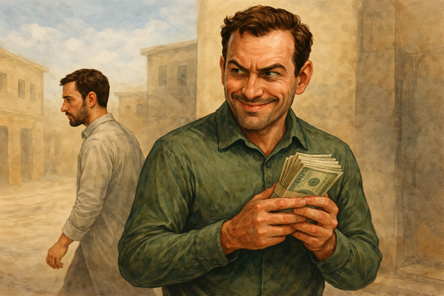 كان هناك شابان صديقان منذ الطفولة، اسمهما سامي وفارس. كان سامي معروفًا بطيبة قلبه وحسن ظنّه بالناس، بينما كان فارس يتصف بالدهاء وحب المال.