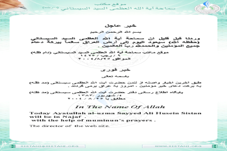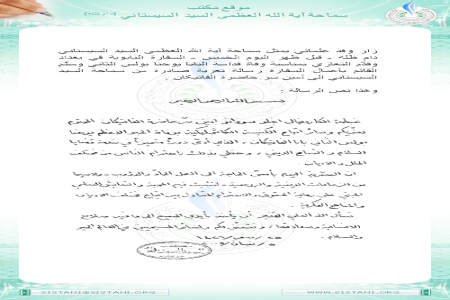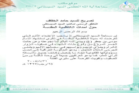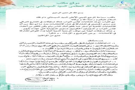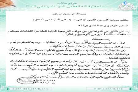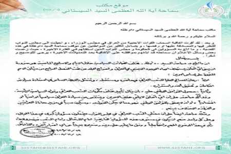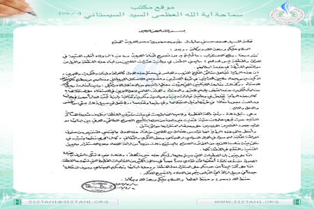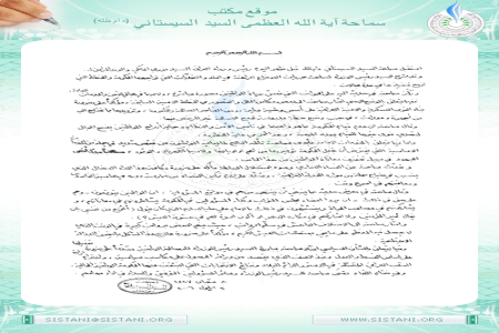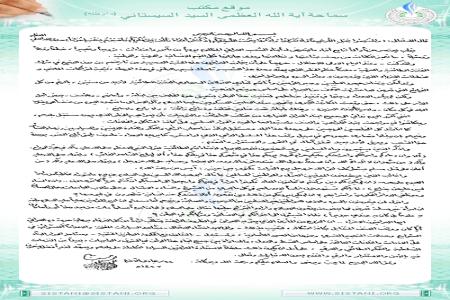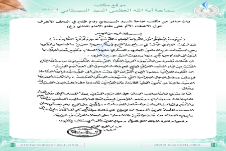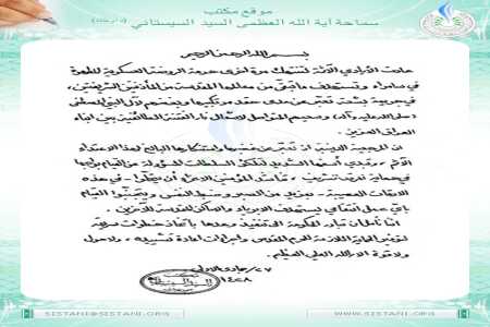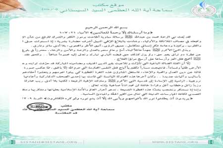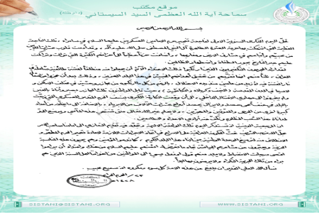 إن العراق وشعبه يواجه تحدياً كبيراً وخطراً عظيماً وإن الارهابيين لا يهدفون إلى السيطرة على بعض المحافظات كنينوى وصلاح الدين فقط بل صرحوا بأنهم يستهدفون جميع المحافظات ولا سيما بغداد وكربلاء المقدسة والنجف الأشرف ، فهم يستهدفون كل العراقيين وفي جميع مناطقهم ، ومن هنا فإن مسؤولية التصدي لهم ومقاتلتهم هي مسؤولية الجميع ولا يختص بطائفةٍ دون أخرى أو بطرفٍ دون آخر.