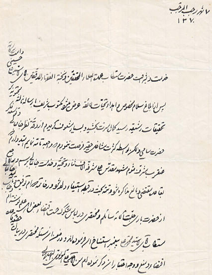 وخلال مدّة اقامته في قم راسل العلاّمة المرحوم السيد علي البهبهاني عالم الأهواز الشهير ومن اتباع مدرسة المحقق الطهراني، وكان موضوع المراسلات بعض مسائل القبلة حيث ناقش سيدنا الأستاذ (مدّ ظلّه) بعض نظريات المحقق الطهراني ووقف السيد البهبهاني موقف المدافع عنها ، وبعد تبادل عدّة رسائل كتب المرحوم السيد البهباني لسيدنا الأستاذ (دام ظلّه) رسالة مؤرخة في ( 7/ رجب /1370 هـ ) ــ وهو شاب في الواحدة والعشرين من العمر ــ يثني فيها على مهارته العلمية واصفاً اياه بـ (عمدة العلماء المحققين ونخبة الفقهاء المدققين) وموكّلا ﱟ تكميل البحث إلى حين اللقاء به عند التشرّف بزيارة الإمام الرضا (عليه السلام ).