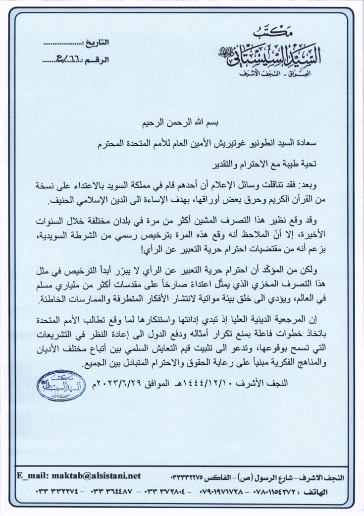 رسالة مكتب سماحة السيد (دام ظله) الى الأمين العام للأمم المتحدة بشأن الاعتداء على نسخة من القرآن الكريم بترخيص من الشرطة السويدية