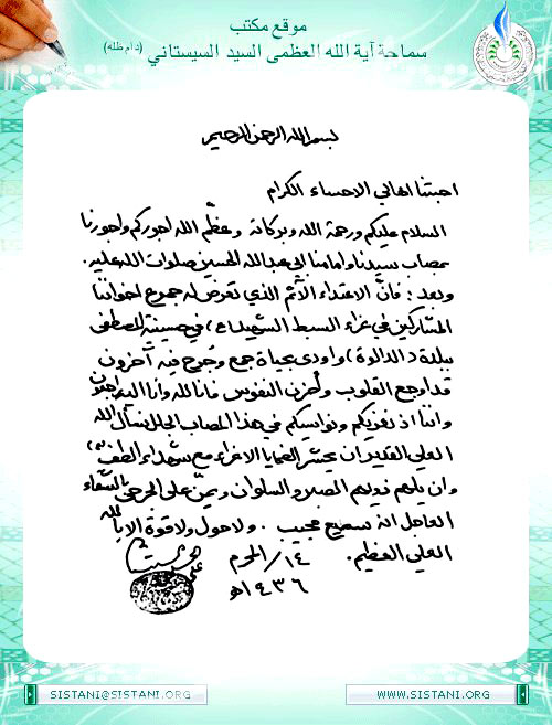 إن العراق وشعبه يواجه تحدياً كبيراً وخطراً عظيماً وإن الارهابيين لا يهدفون إلى السيطرة على بعض المحافظات كنينوى وصلاح الدين فقط بل صرحوا بأنهم يستهدفون جميع المحافظات ولا سيما بغداد وكربلاء المقدسة والنجف الأشرف ، فهم يستهدفون كل العراقيين وفي جميع مناطقهم ، ومن هنا فإن مسؤولية التصدي لهم ومقاتلتهم هي مسؤولية الجميع ولا يختص بطائفةٍ دون أخرى أو بطرفٍ دون آخر.