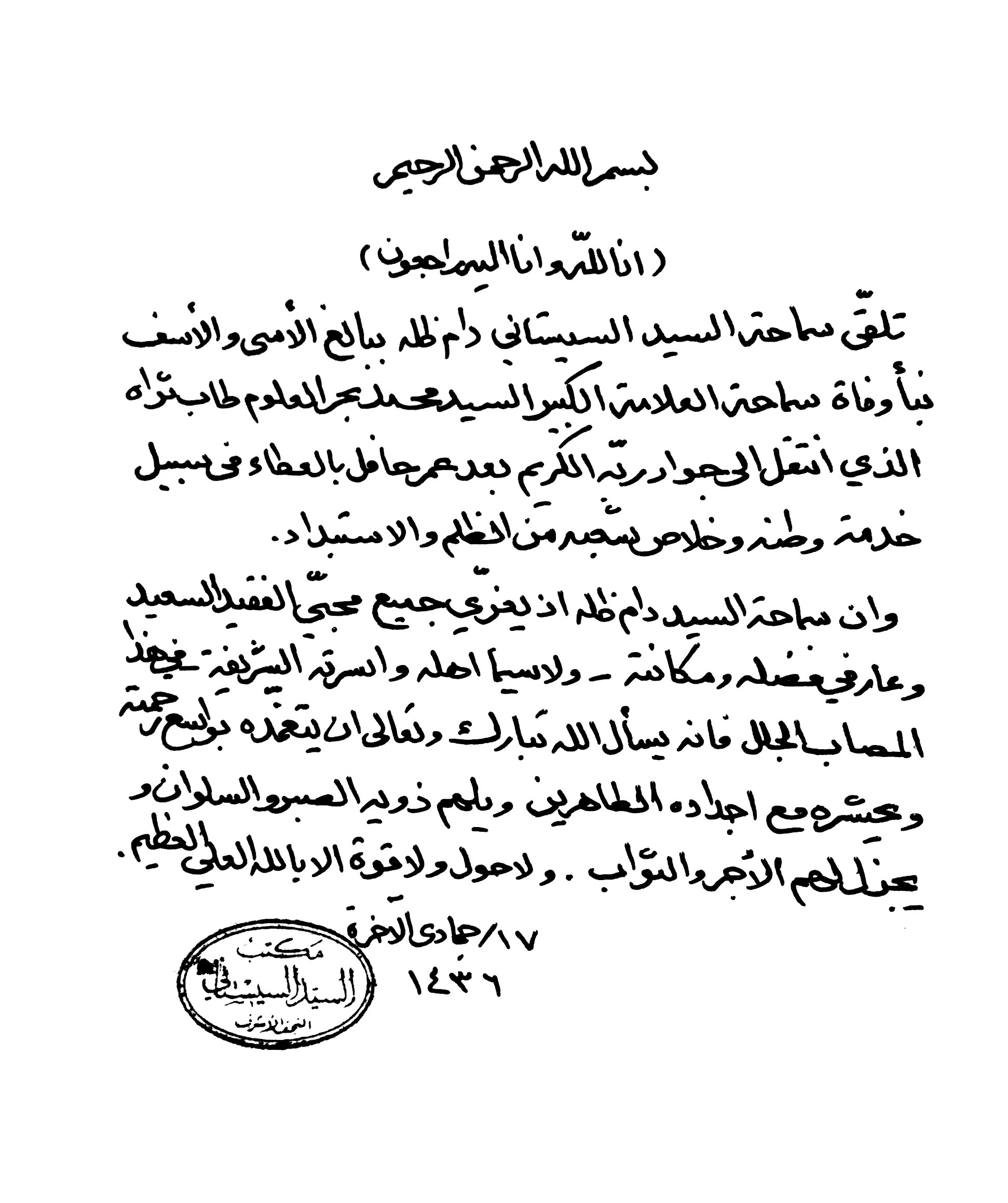 بيان مكتب سماحة السيد ( دام ظلّه ) بمناسبة وفاة العلاّمة الكبير السيد محمد بحر العلوم ( طاب ثراه )
