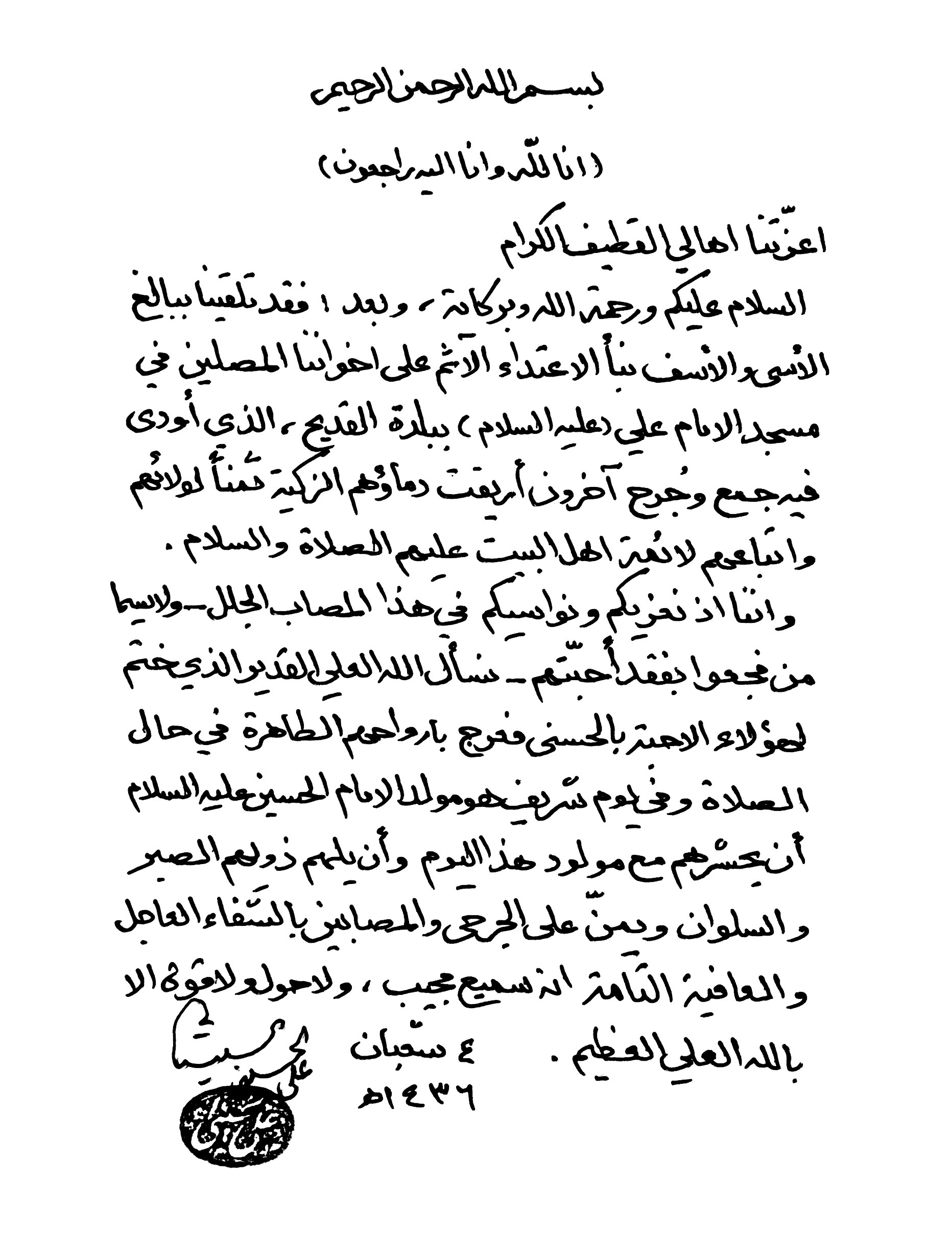 رسالة تعزية الى أهالي القطيف