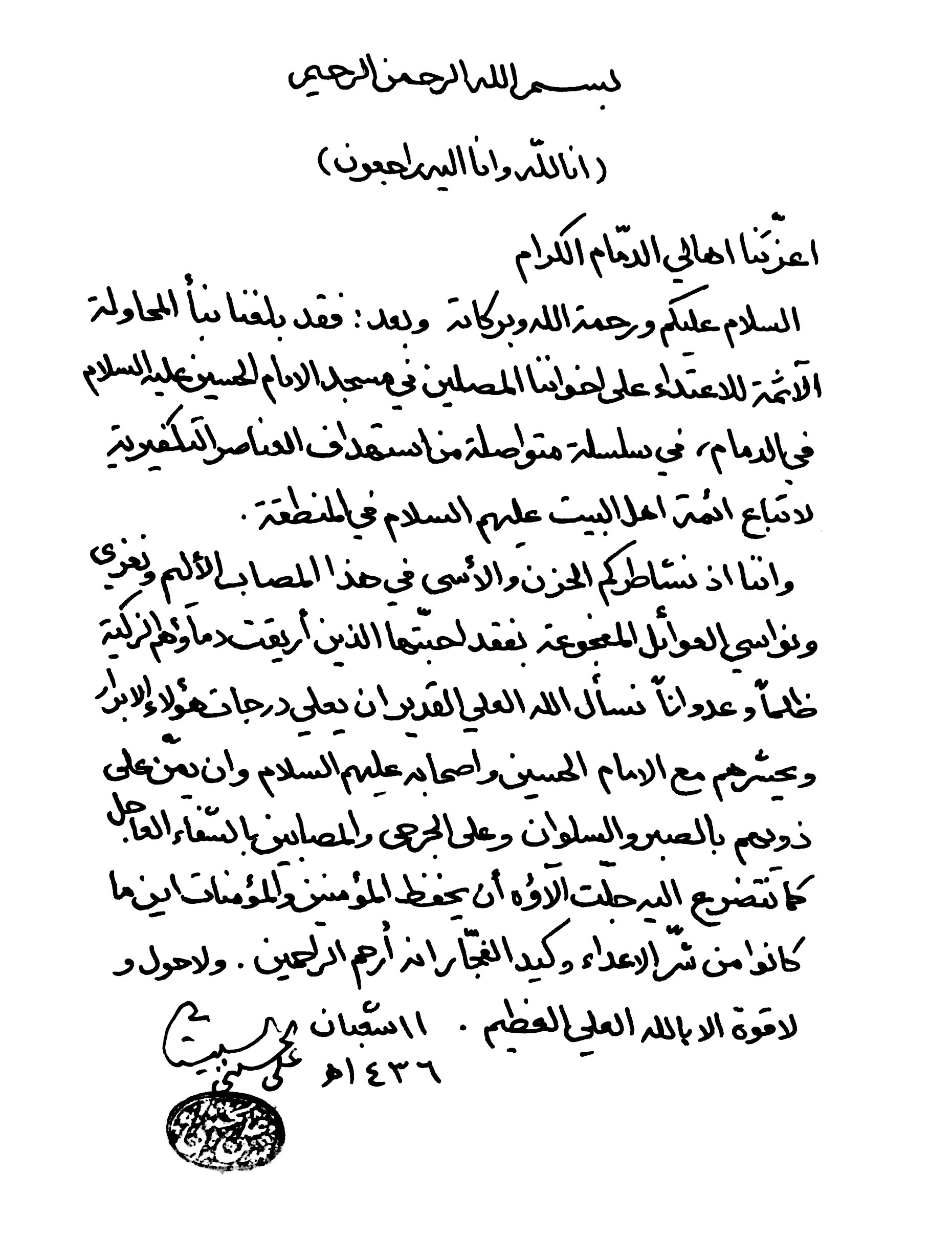 إن العراق وشعبه يواجه تحدياً كبيراً وخطراً عظيماً وإن الارهابيين لا يهدفون إلى السيطرة على بعض المحافظات كنينوى وصلاح الدين فقط بل صرحوا بأنهم يستهدفون جميع المحافظات ولا سيما بغداد وكربلاء المقدسة والنجف الأشرف ، فهم يستهدفون كل العراقيين وفي جميع مناطقهم ، ومن هنا فإن مسؤولية التصدي لهم ومقاتلتهم هي مسؤولية الجميع ولا يختص بطائفةٍ دون أخرى أو بطرفٍ دون آخر.