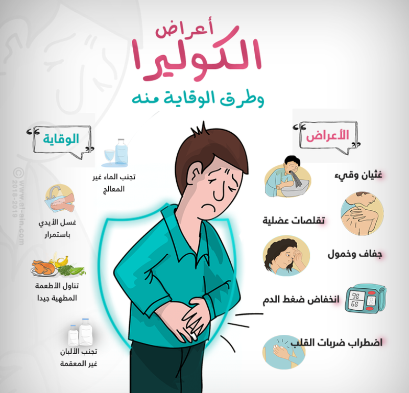 الكوليرا مرض وبائي حاد تسببه بكتيريا Vibrio cholerae ينتقل عبر شرب ماء أو تناول طعام ملوث ببراز أو قيء أشخاص مصابين. تتميز أعراضه بظهور إسهال مائي غزير مع قيء وجفاف سريع قد يؤدي إلى هبوط ضغط الدم وفشل في الأعضاء إذا لم يُعالج فوراً. العلاج يعتمد على تعويض السوائل والأملاح بالفم أو الوريد وفي بعض الحالات استخدام المضادات الحيوية لتقليل مدة المرض وشدته كما أن الوقاية تعتمد على تحسين النظافة الشخصية وتوفير مياه شرب آمنة واستخدام اللقاحات المتاحة في المناطق الموبوءة.