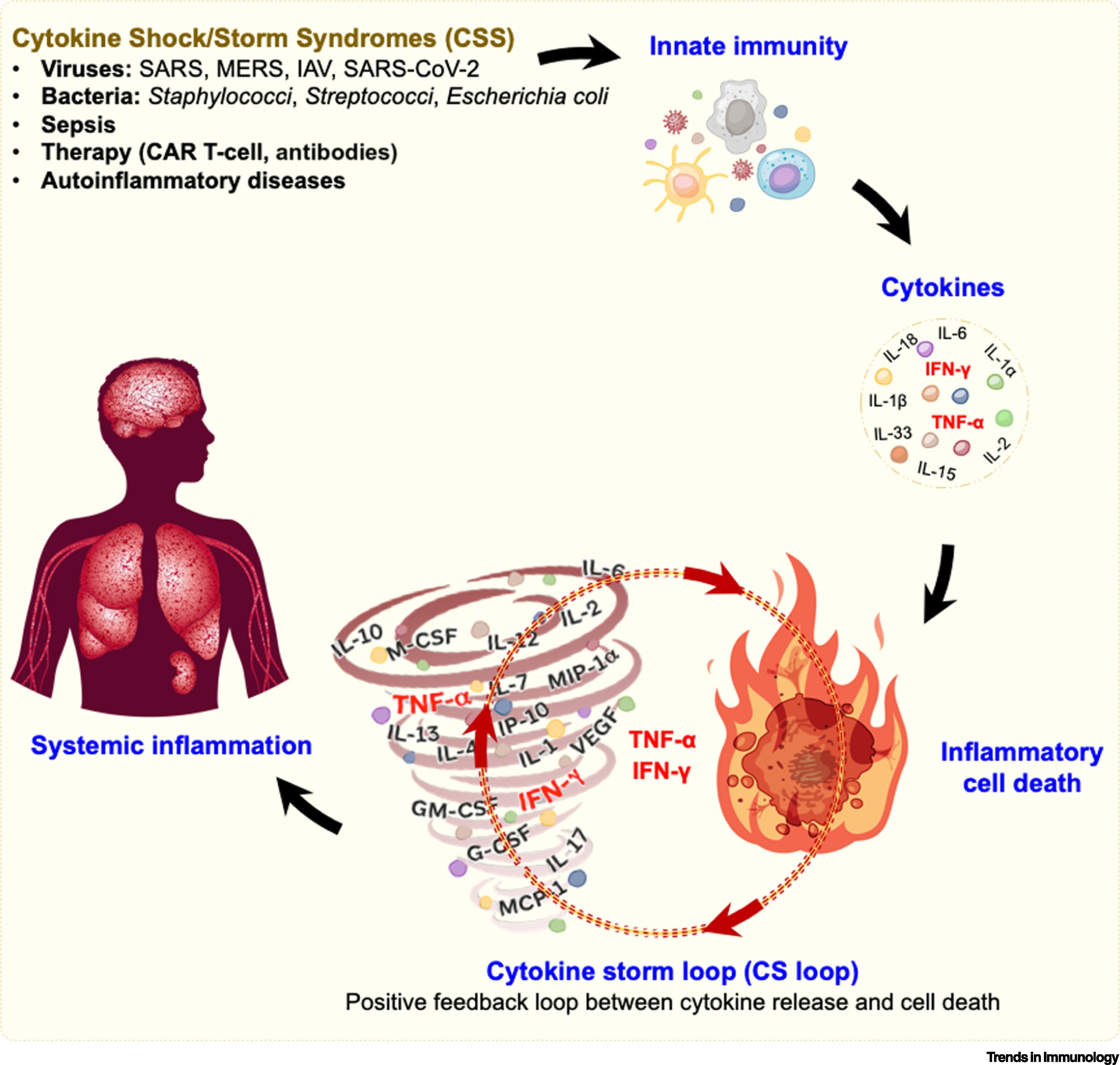 هي حالة خطيرة يحدث فيها إفراط شديد وغير منضبط في نشاط الجهاز المناعي إذ تُفرز كميات كبيرة من السيتوكينات الالتهابية مثل IL-6 وTNF-α وIL-1β التي تنسق عادةً الدفاع ضد العدوى. عندما تتصاعد هذه الإشارات بشكل مفرط تتحول من استجابة مفيدة إلى ضرر واسع فينتج التهاب شديد في الأنسجة والأعضاء مثل الرئتين والقلب والكبد وقد يؤدي إلى متلازمة الضائقة التنفسية الحادة ARDS أو الفشل المتعدد للأعضاء. تظهر هذه الحالة في بعض الإصابات الفيروسية الشديدة مثل الحالات الحرجة من…