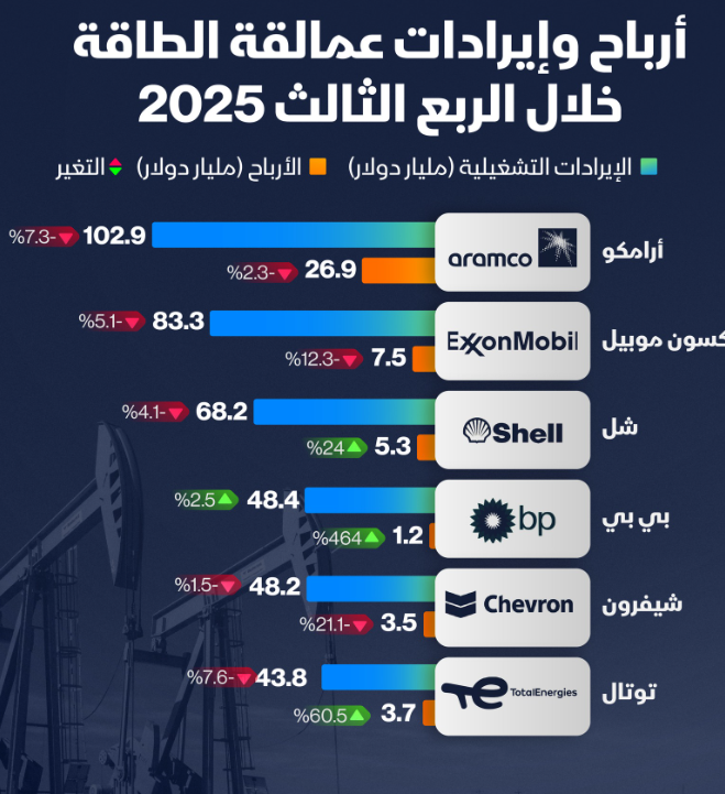 رغم تراجعها بالربع الثالث 2025 .. الإيرادات والأرباح الفصلية لشركة "أرامكو" السعودية الأكبر بين عمالقة الطاقة..