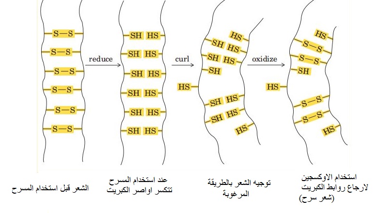 تحتوي مسرحات الشعر على مواد كيمائية مختزلة مثل (Ammonium thioglycolate) تعمل على تكسير روابط الكبريت الثنائية المتتشابكة بين سلاسل البروتين المكون للشعر (وهي روابط او اواصر مهمة تعطي للشعر والروتين قوة كبيرة) فيصبح الشعر مرن جدا يمكن تسريحه او تجعيده حسب الرغبة وبعدها يتم تطبيق مادة الاوكسجين (بيروكسيد الهيدروجين: عامل مؤكسد) يقوم بأعادة تكوين اواصر الكبريت وبهذه الطريقة يستعيد الشعر قوته وبلمس ناعم وسرح.
