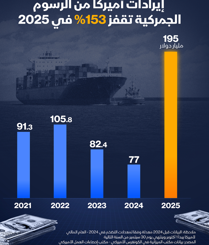 - هذه القفزة تعكس العديد من الرسوم الجمركية التي فرضها الرئيس الأميركي منذ عودته إلى البيت الأبيض ودخل معظمها حيز التنفيذ مطلع أبريل. وتراجع العجز في الموازنة الأميركية قليلاً خلال السنة المالية 2025 مع تحقيق عائدات قياسية من الرسوم الجمركية، رغم أن وتيرة الاقتراض لا تزال مرتفعة تاريخياً.