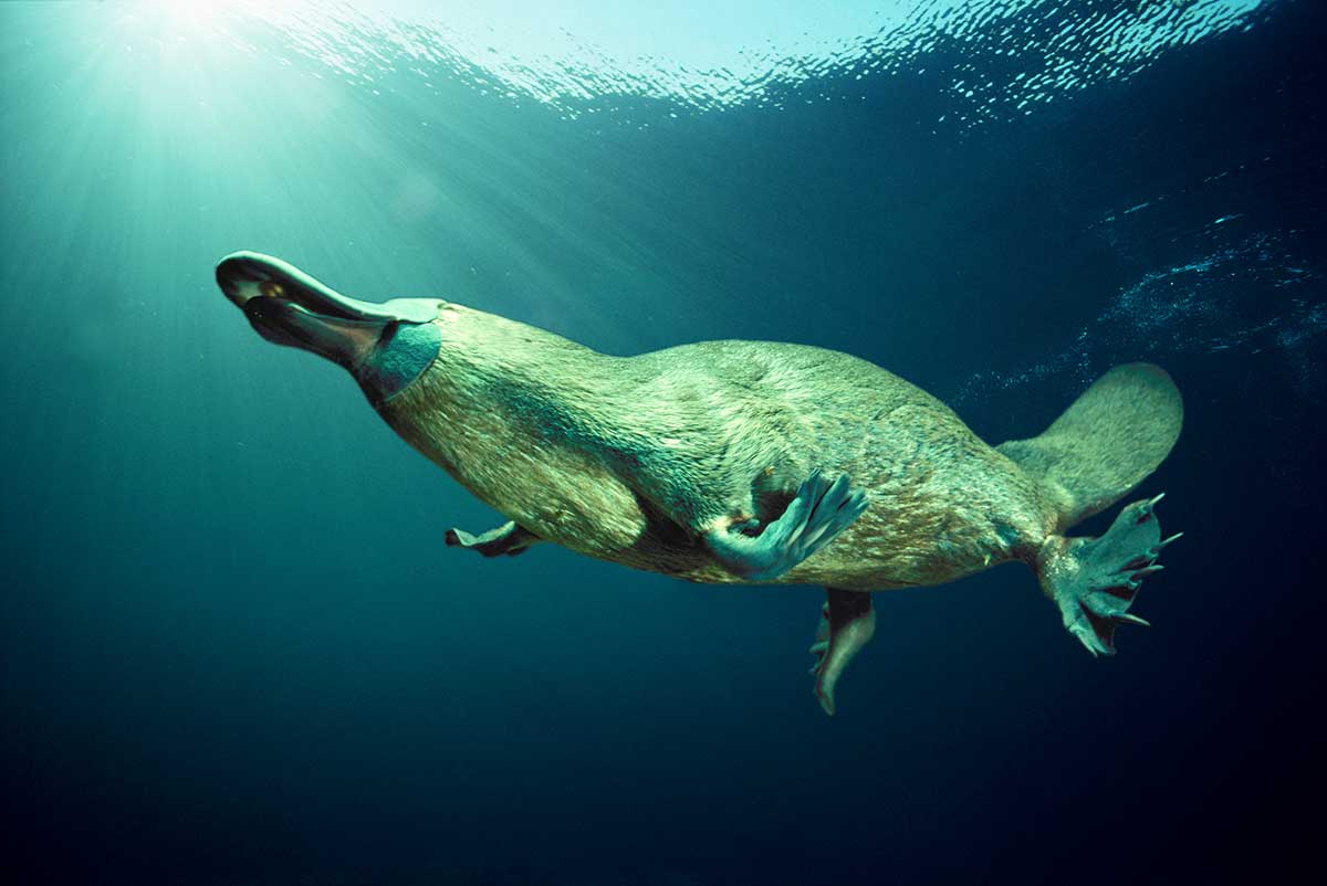 The body is flattened and streamlined. The limbs are short and muscular. As in other monotremes, the limbs of the platypus are set in a permanent push-up position, the upper limb bones extending out from the sides of the body, horizontal to the ground, the lower limb bones going straight down. Although an excellent swimmer, the platypus is clumsy, and seldom does so anyway, except within its tunnels, since it burns up twice the body energy moving about on land as it does swimming underwater.
