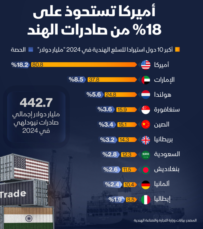 الولايات المتحدة تتصدر قائمة الدول التي استقبلت السلع الهندية عام 2024 بما يقارب 81 مليار دولار
