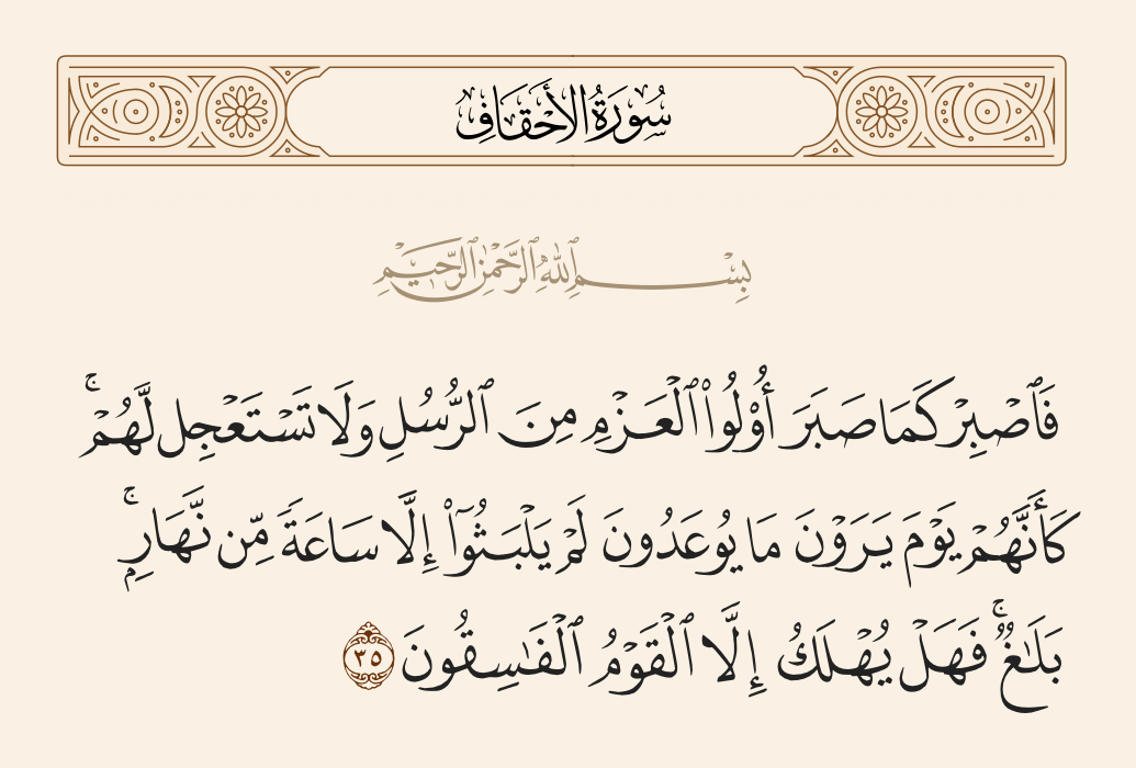 قال تعالى: {فَاصْبِرْ كَمَا صَبَرَ أُولُو الْعَزْمِ مِنَ الرُّسُلِ وَلَا تَسْتَعْجِلْ لَهُمْ كَأَنَّهُمْ يَوْمَ يَرَوْنَ مَا يُوعَدُونَ لَمْ يَلْبَثُوا إِلَّا سَاعَةً مِنْ نَهَارٍ بَلَاغٌ فَهَلْ يُهْلَكُ إِلَّا الْقَوْمُ الْفَاسِقُونَ} [الأحقاف: 35].