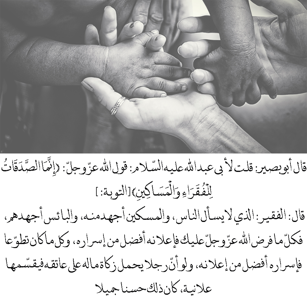 قال : « الفقير : الذي لا يسأل الناس ، والمسكين أجهد منه ، والبائس أجهدهم ، فكلّ ما فرض اللّه عزّ وجلّ عليك فإعلانه أفضل من إسراره ، وكل ما كان تطوّعا فإسراره أفضل من إعلانه ، ولو أنّ رجلا يحمل زكاة ماله على عاتقه فيقسّمها علانية ، كان ذلك حسنا جميلا »