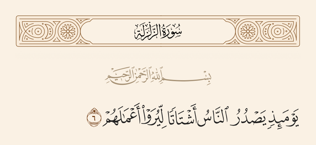 { يَوْمَئِذٍ يَصْدُرُ النَّاسُ أَشْتَاتًا لِيُرَوْا أَعْمَالَهُمْ }