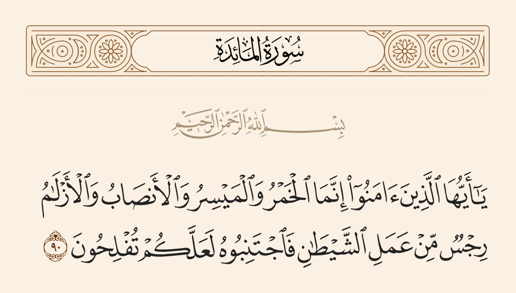 { يَا أَيُّهَا الَّذِينَ آمَنُوا إِنَّمَا الْخَمْرُ ... رِجْسٌ مِنْ عَمَلِ الشَّيْطَانِ فَاجْتَنِبُوهُ}