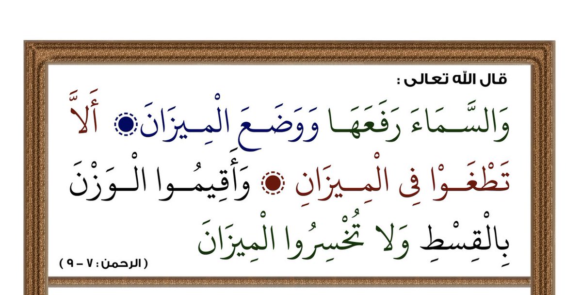 قال تعالى : { وَالسَّمَاءَ رَفَعَهَا وَوَضَعَ الْمِيزَانَ * أَلَّا تَطْغَوْا فِي الْمِيزَانِ * وَأَقِيمُوا الْوَزْنَ بِالْقِسْطِ وَلَا تُخْسِرُوا الْمِيزَانَ } [الرحمن : 7 - 9] عبر بالميزان عن العدل ، لانه من اثره ومن اظهر افعاله للحاسة ، اذ كان العدل مراعاة الاستقامة على حاق الوسط في طرفي الافراط والتفريط اللذين هما ككفتي الميزان ، مهما رجحت احداهما فالنقصان لازم والخسران قائم .
