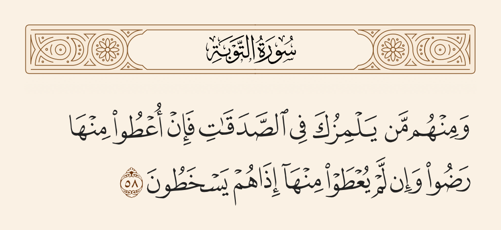 قال تعالى : { وَمِنْهُمْ مَنْ يَلْمِزُكَ فِي الصَّدَقَاتِ فَإِنْ أُعْطُوا مِنْهَا رَضُوا وَإِنْ لَمْ يُعْطَوْا مِنْهَا إِذَا هُمْ يَسْخَطُونَ } [التوبة : 58] .