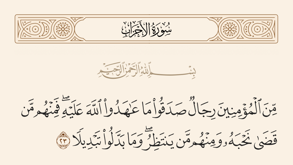 عن جابر الجعفي، عن أبي جعفر (عليه السلام)،عن أميرالمؤمنين ( عليه واله السلام) في حديث طويل يقول فيه: ولقد كنت عاهدت الله تعالى ورسوله أنا وعمي حمزة وأخي جعفر وابن عمي عبيدة على أمر وفينا به لله تعالى ولرسوله، فتقدمني أصحابي، وتخلفت بعدهم لما أراد الله تعالى، فأنزل الله فينا: {من المؤمنين رجال صدقوا ما عاهدوا الله عليه} الآية(1).