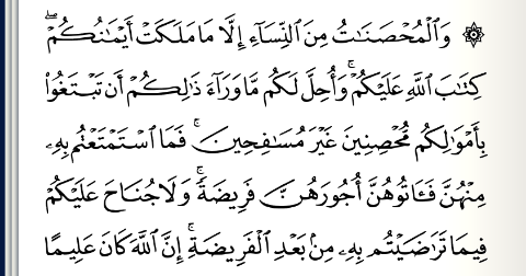 {فَمَا اسْتَمْتَعْتُمْ بِهِ مِنْهُنَّ فَآتُوهُنَّ أُجُورَهُنَّ فَرِيضَةً وَلَا جُنَاحَ عَلَيْكُمْ فِيمَا تَرَاضَيْتُمْ بِهِ مِنْ بَعْدِ الْفَرِيضَةِ إِنَّ اللَّهَ كَانَ عَلِيمًا حَكِيمًا} [النساء : 24] .