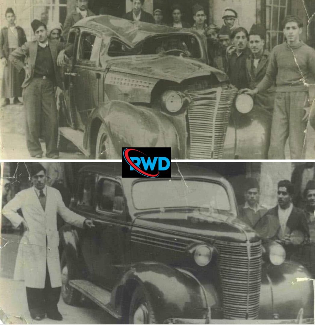 صورتان لسيارة قديمة تعرضت لحادث قبل وبعد التصليح حيث قاما بتصليحها الحاج حميد علي حداد واخيه عبد الوهاب علي حداد الذين امتهنا هذه المهنة وابدعا بها حيث كان جميع العمل يدوي في البصرة عام 1938.