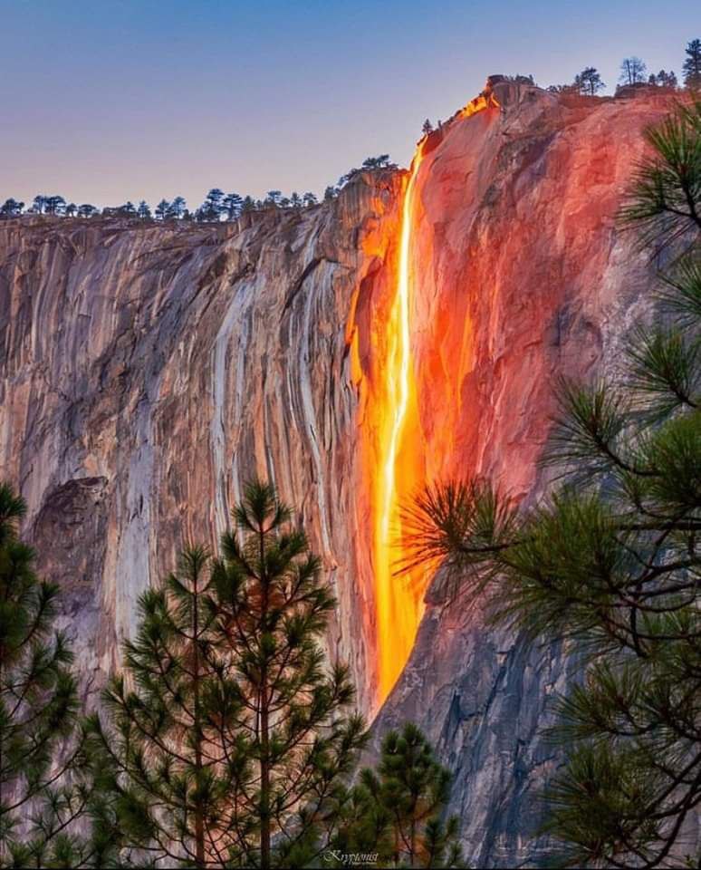 ما تراه ليس ناراً تلتهب، بل مياه ندية تنسكب. انعكاس أشعة الشمس عند الغروب على شلال هورستايل. الولايات المتحدة.