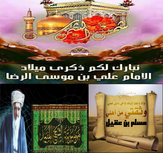 حدث في مثل هذا اليوم(11 ذو القعدة)::*(مولد مولانا ثامن الحجج الأطهار الإمام علي بن موسى الرضا(ع) سنة 148هـ بالمدينة المنورة،وأمه الطاهرة: السيدة تكتم(ع)وقيل:(نجمة)، وبعد ولادتها للإمام(ع) سُميت بـ(الطاهرة)،وتكنى بـ(أم البنين).تولى منصب الإمامة بعد شهادة أبيه الإمام الكاظم(ع) سنة 183هـ.)*(ولادة الفقيه المشهور الشيخ المفيد محمد بن محمد بن النعمان العكبري الحارثي(ره) صاحب كتاب(الإرشاد)سنة 336هـ.)*(60هـ.إرسال مسلم بن عقيل رسائل للإمام الحسين (ع) على بيعة معظم الشيعة في الكوفة وودعوتهم إياك للكوفة.