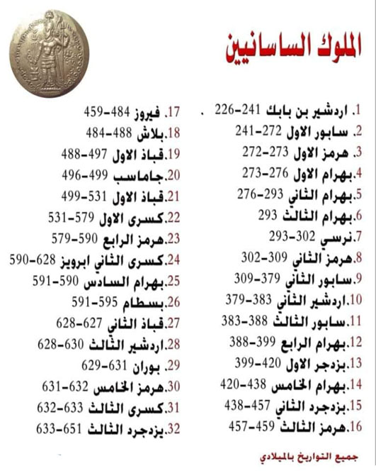ملوك الدولة الساسانية:: حكمت الأسرة الساسانية فارس خلال حقبة ماقبل الإسلام، وقد أسسها أردشير الأول بعد أن هزم آخر الملوك الأشكانيون الملك اردوان الخامس، وقد انتهت عندما هزم المسلمون آخر الملوك الساسان يزدجرد الثالث (632–651) وأصبحت فارس جزءا من الخلافة الإسلامية.