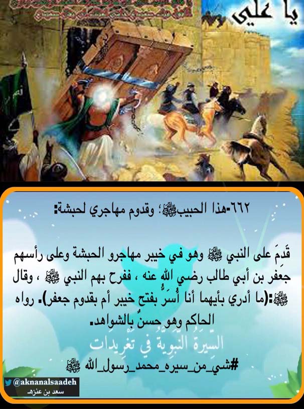 حدث في مثل هذا اليوم(15 محرم)::(2هـ - خرج النبي(ص)إلى غزوة قرقرة الكدر، وقد يقال: قرارة الكدر)(7هـ -فُتحت حصون خيبر وفي السيرة التي ألفها ابن إسحاق أن النبي(ص) خرج إلى خيبر في المحرم، وفتحها في صفر سنة 7 هـ)(7هـ - التقى رسول الله (صلى الله عليه واله) بابن عمه جعفر الطيار قادماً من الحبشة بعد أن غاب فيها نحو 15 سنة. وقد فرح النبي (صلى الله عليه واله) بلقائه فرحة تساوي فرحته بفتح خيبر، حتى روي عنه أنه قال: «ما أدري بأيهما أنا أسرّ، أبفتح خيبر، أم بقدوم جعفر؟).
